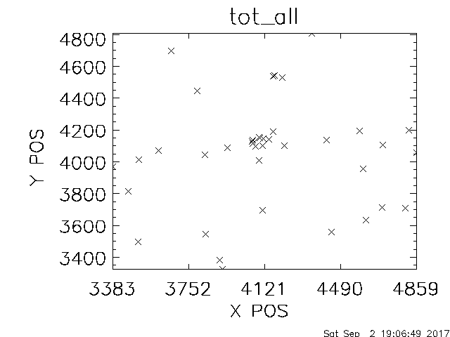 Statistics: # IMAGE NPIX MEAN RMS MIN MAX ACIS_aug17 6004901 8.364 29.287 0.0 5552 I2 node 0 262654 9.882037 4.051841 0.0 96.0 I2 node 1 262654 10.367421 7.478422 0.0 2614.0 I2 node 2 262654 10.161945 4.011220 0.0 106.0 I2 node 3 262654 10.184233 7.006918 0.0 2346.0 I3 node 0 262654 10.557823 9.911892 0.0 4547.0 I3 node 1 262654 11.090547 8.783191 0.0 2092.0 I3 node 2 262654 9.987559 3.902702 0.0 92.0 I3 node 3 262654 10.074555 4.720405 0.0 1283.0 S2 node 0 262654 6.648227 5.435089 0.0 380.0 S2 node 1 262654 7.049560 7.241540 0.0 526.0 S2 node 2 262654 8.557755 14.195049 0.0 601.0 S2 node 3 262654 10.498879 29.237717 0.0 4190.0 S3 node 0 262654 20.365816 118.709293 0.0 5552.0 S3 node 1 262654 14.850082 23.428352 0.0 490.0 S3 node 2 262654 14.986952 25.369265 0.0 376.0 S3 node 3 262654 12.280252 16.044098 0.0 299.0