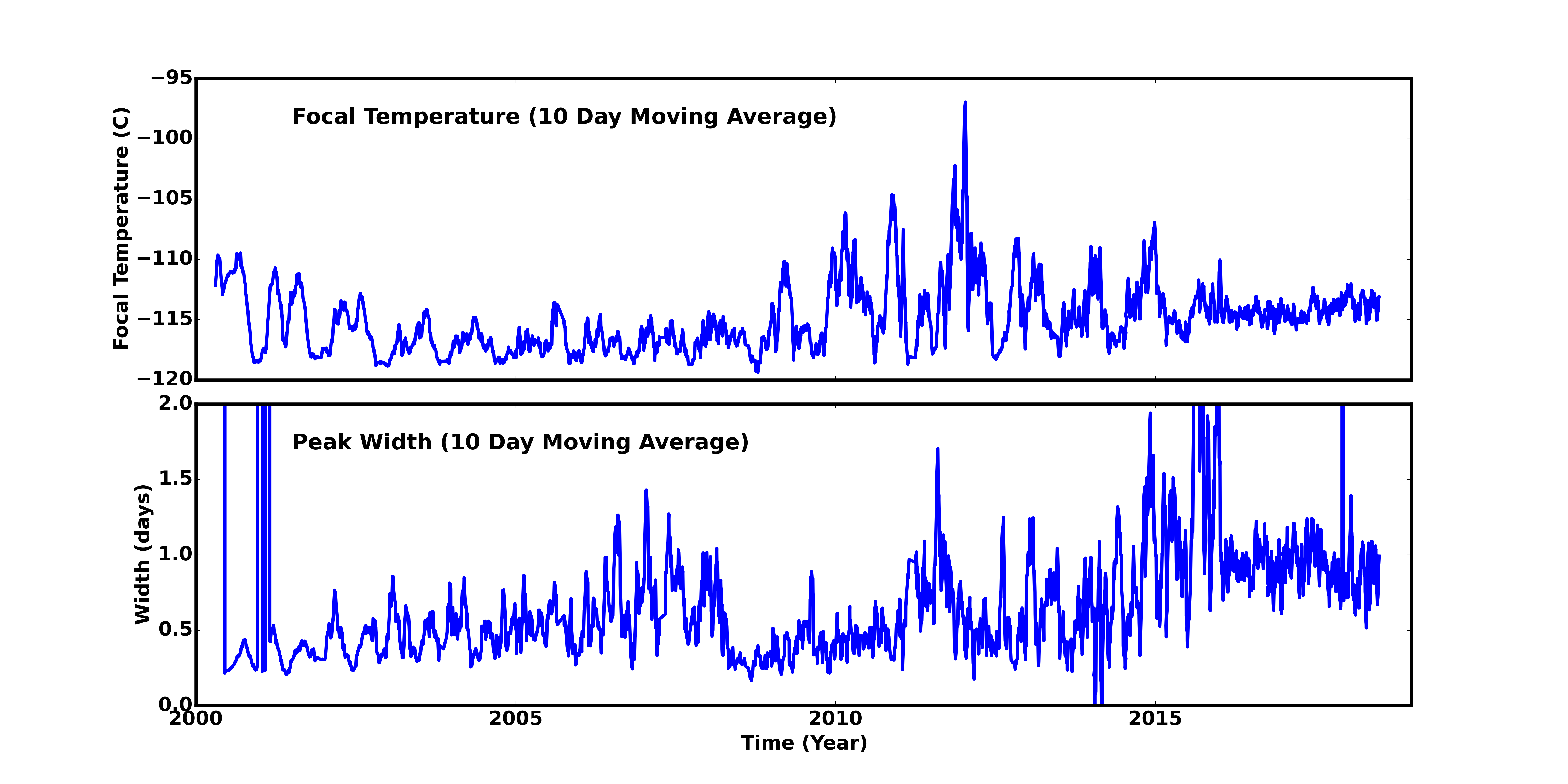 We are using 10 period moving averages to show trends of peak temperatures and peak widths. Note, the gaps in the width plot are due to missing/corrupted data.