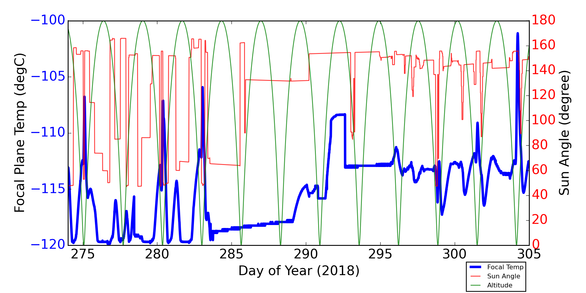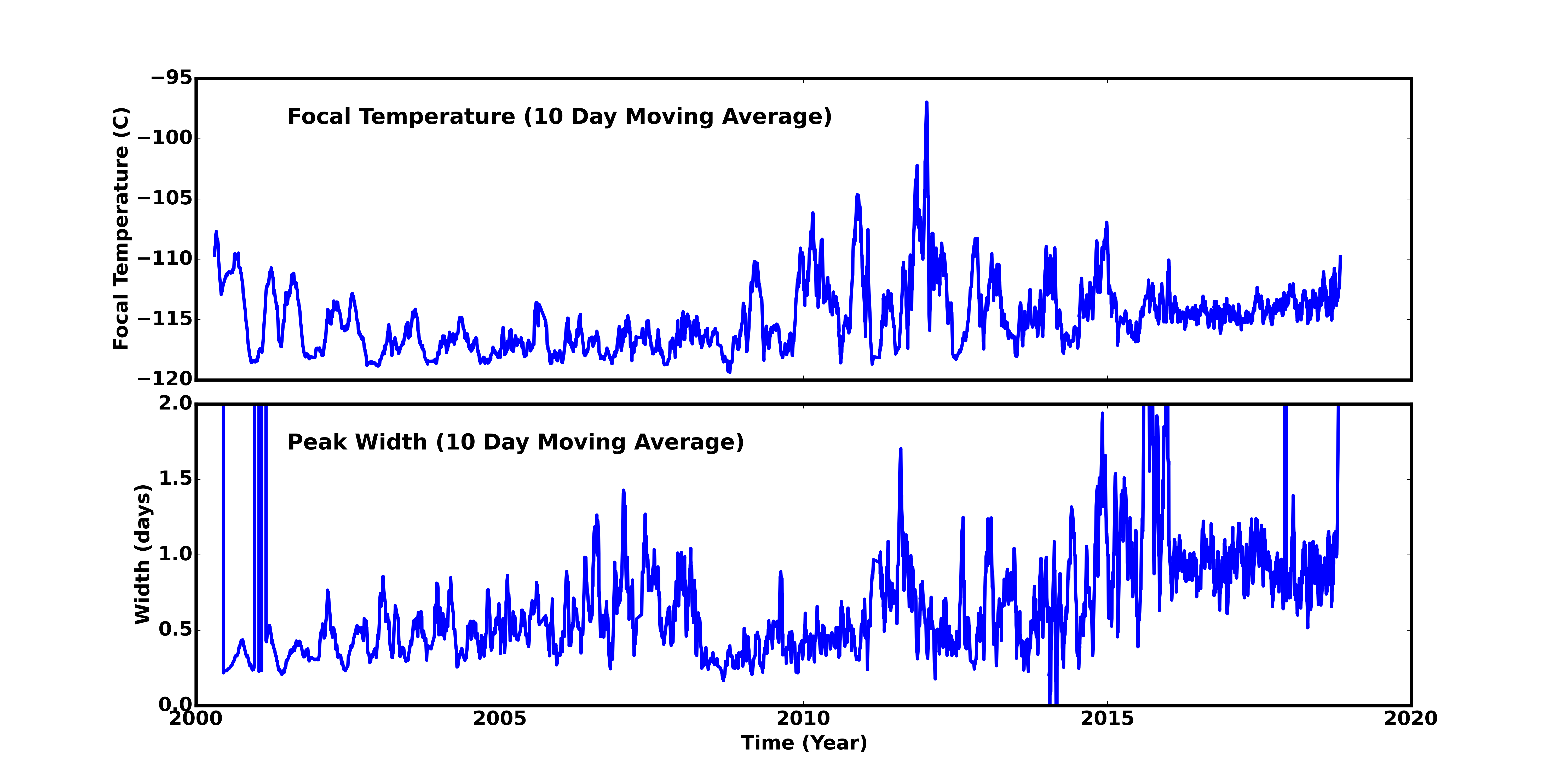 We are using 10 period moving averages to show trends of peak temperatures and peak widths. Note, the gaps in the width plot are due to missing/corrupted data.