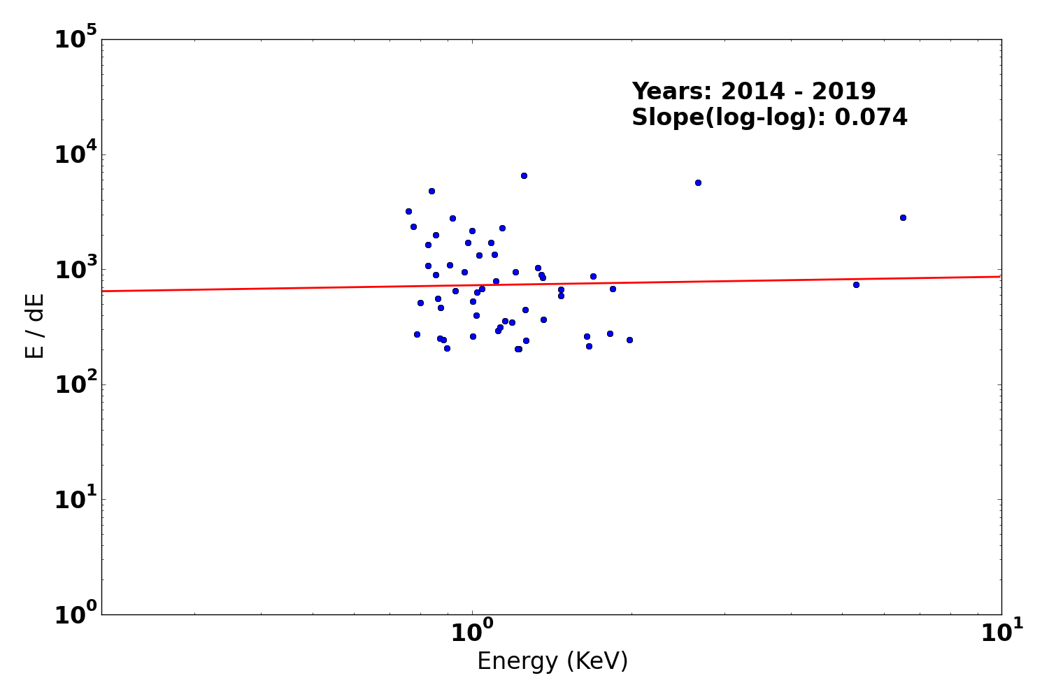- The exposure map is opened with ds9, and check a distribution of count rates against energy. From this, estimate the upper threshold value. Any events beyond this upper threshold are assumed erroneous events such as bad pixels.