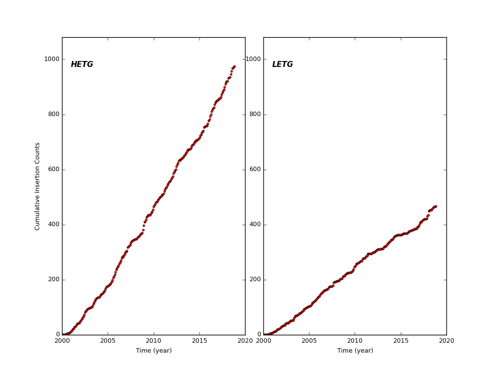 We report CTIs with a refined data definition. CTIs were computed for the temperature dependency corrected data. Please see CTI page for detailed explanation. CTI's are computed for Mn K alpha, and defined as slope/intercept x10^4 of row # vs ADU. Data file: here