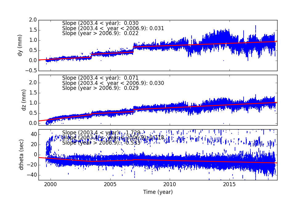 The sudden shift around DOM = 1400, 2700 and 4400 are due to fid light drift (see a memo by Aldcroft fiducial light drift). On the dtheta plot, two tracks are clearly observed. The track around 0.01 is due to HRC-I, and all others are clustered around -0.002. For more detail, please see SIM Shift and Twist Trend page