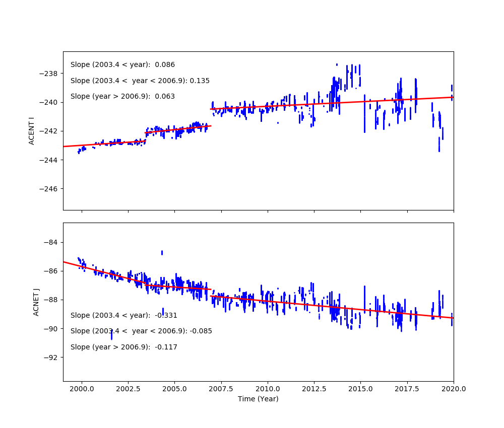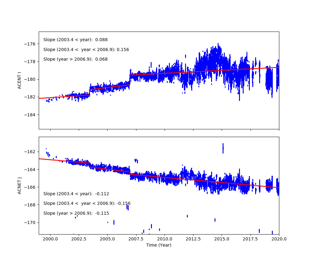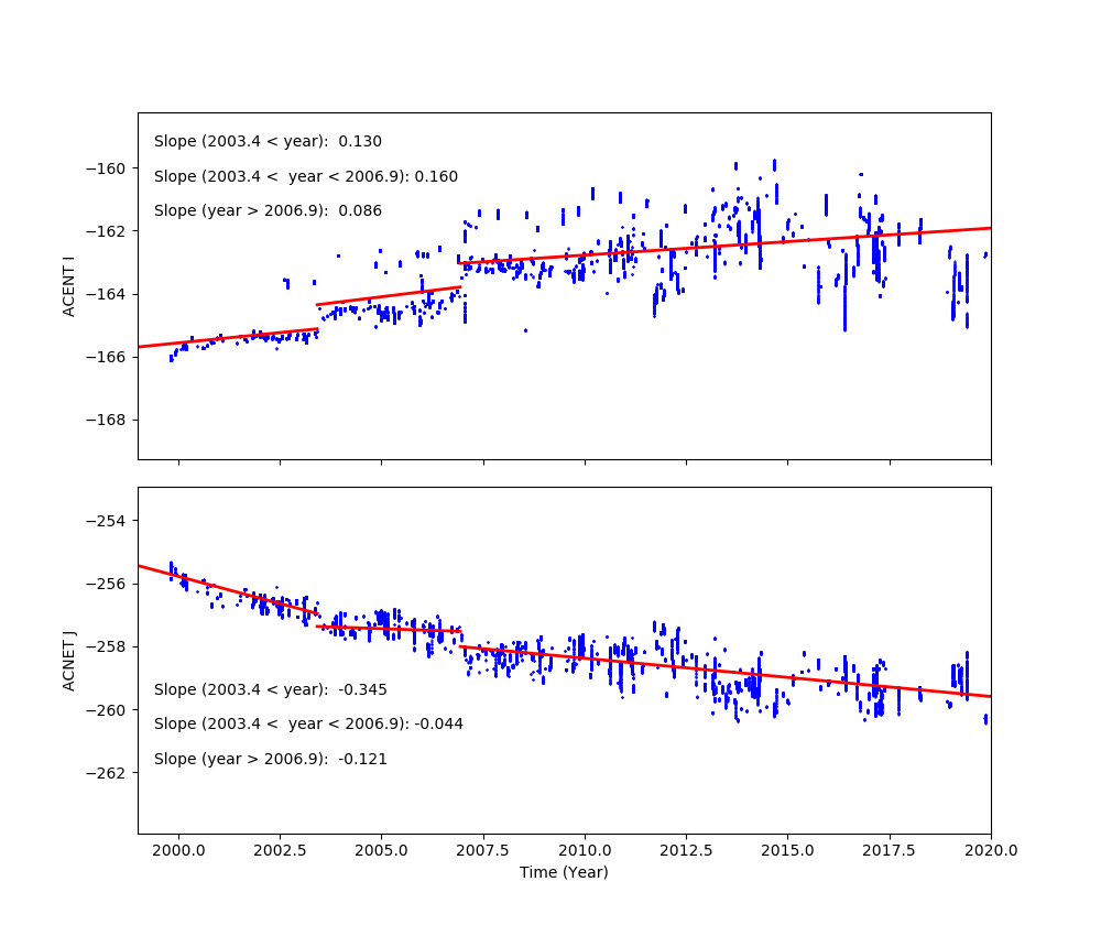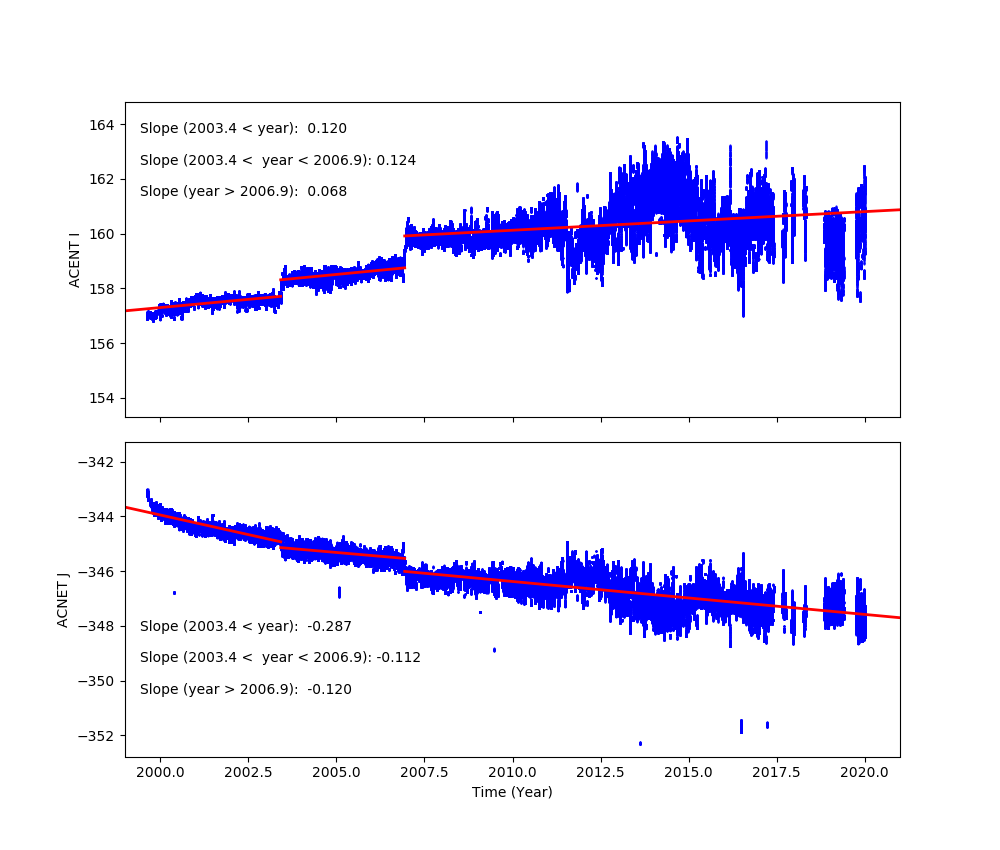 Fid light positions on ACA drift with time. The drift trends of Fid light 2 with ACIS-I and ACIS-S configurations are shown below.
