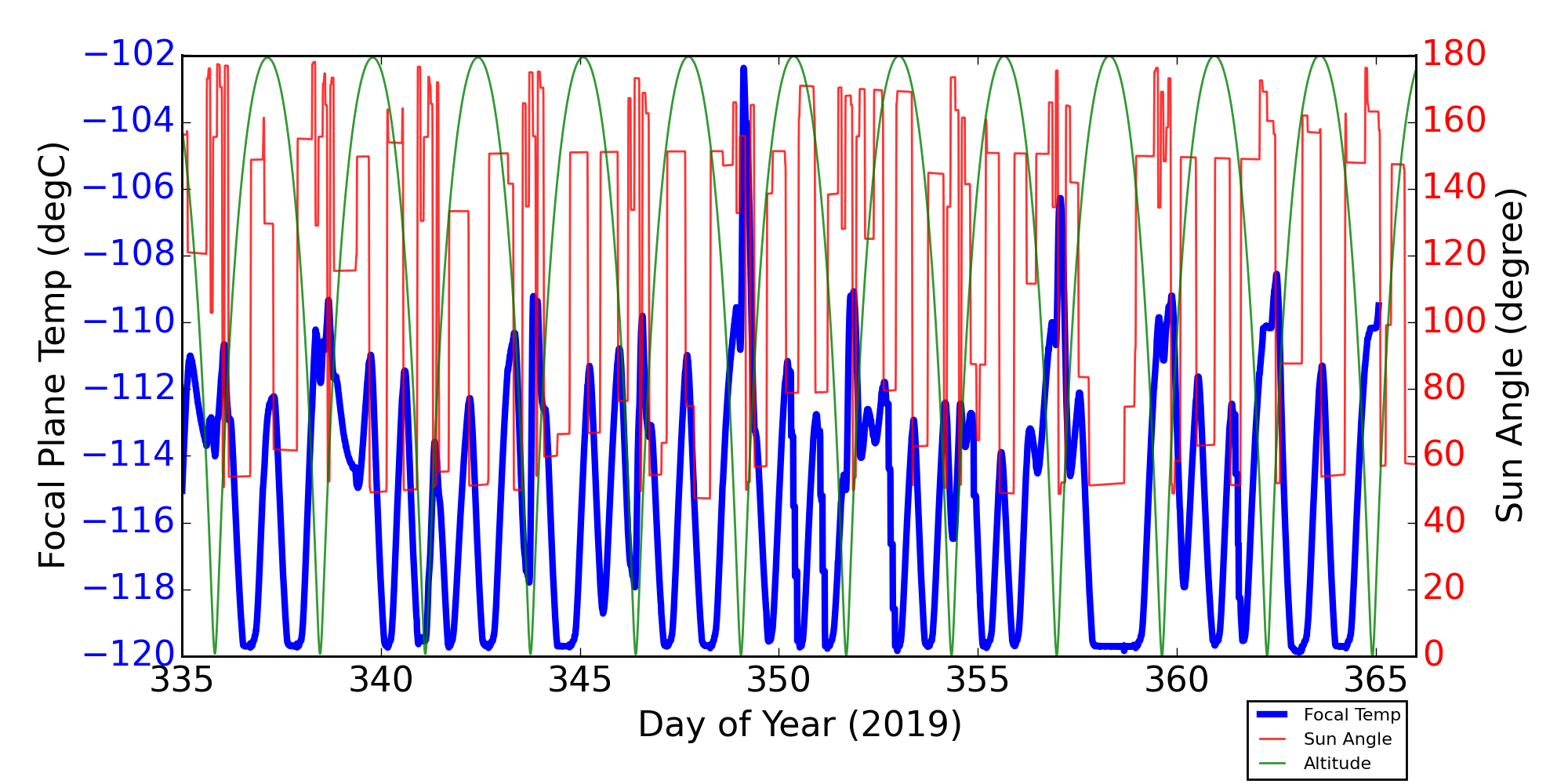 We are using 10 period moving averages to show trends of peak temperatures and peak widths. Note, the gaps in the width plot are due to missing/corrupted data.