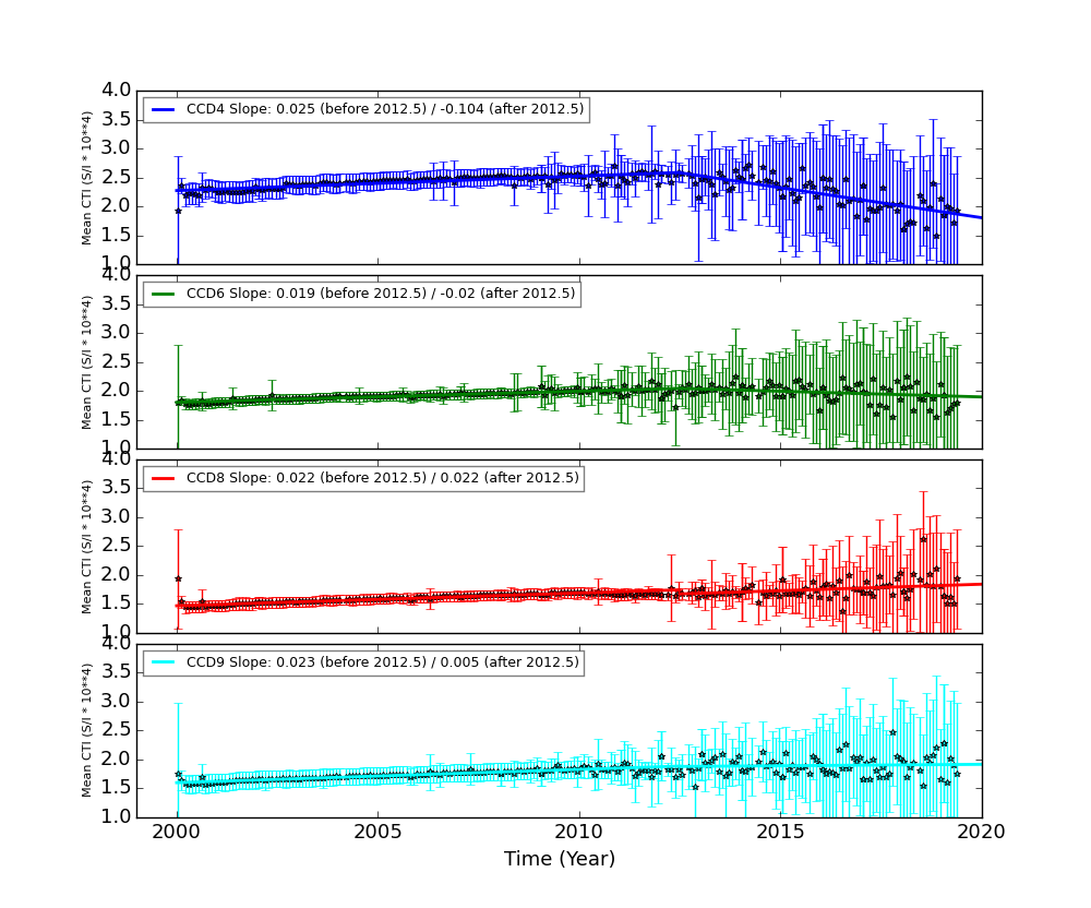 We report CTIs with a refined data definition. CTIs were computed for the temperature dependency corrected data. Please see CTI page for detailed explanation. CTI's are computed for Mn K alpha, and defined as slope/intercept x10^4 of row # vs ADU. Data file: here