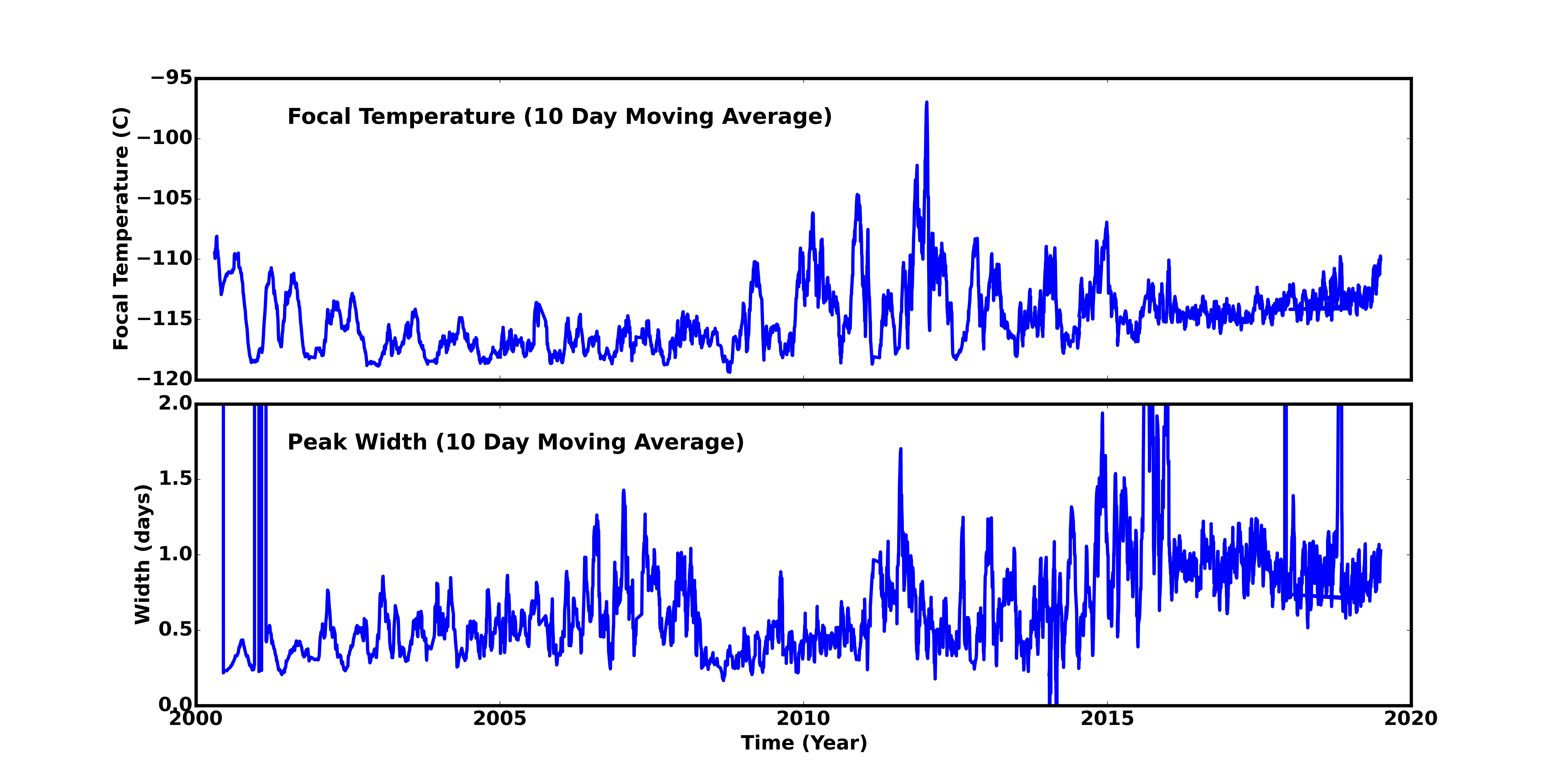 We are using 10 period moving averages to show trends of peak temperatures and peak widths. Note, the gaps in the width plot are due to missing/corrupted data.