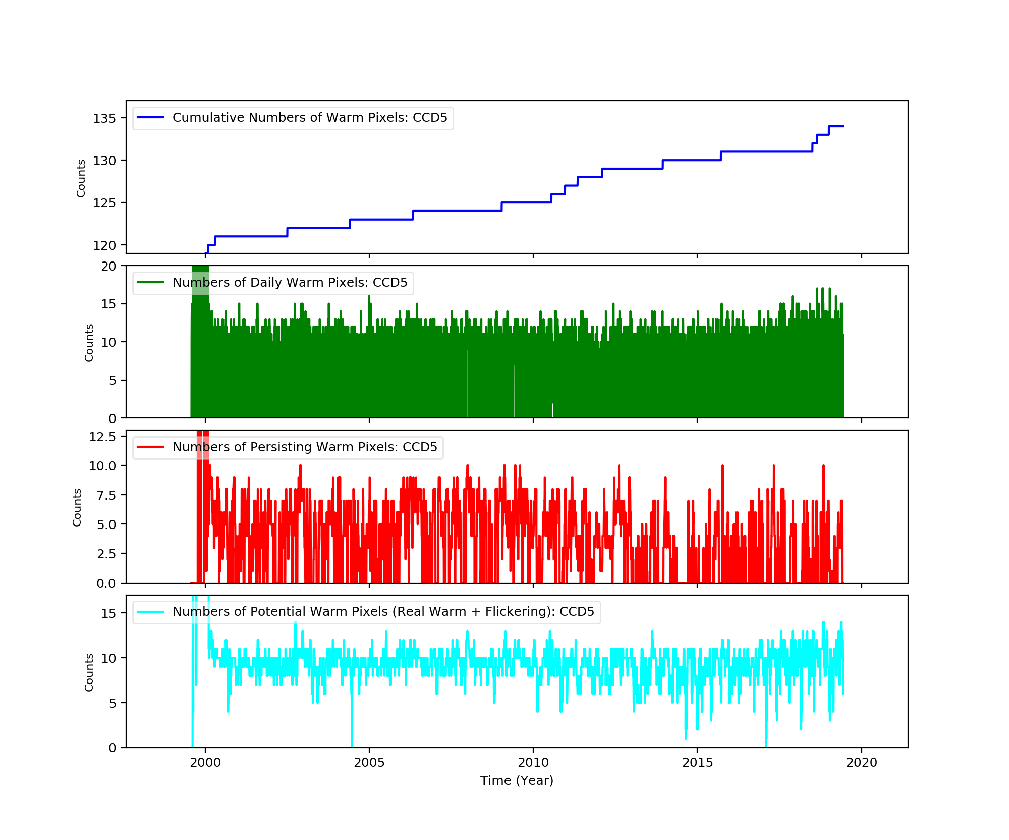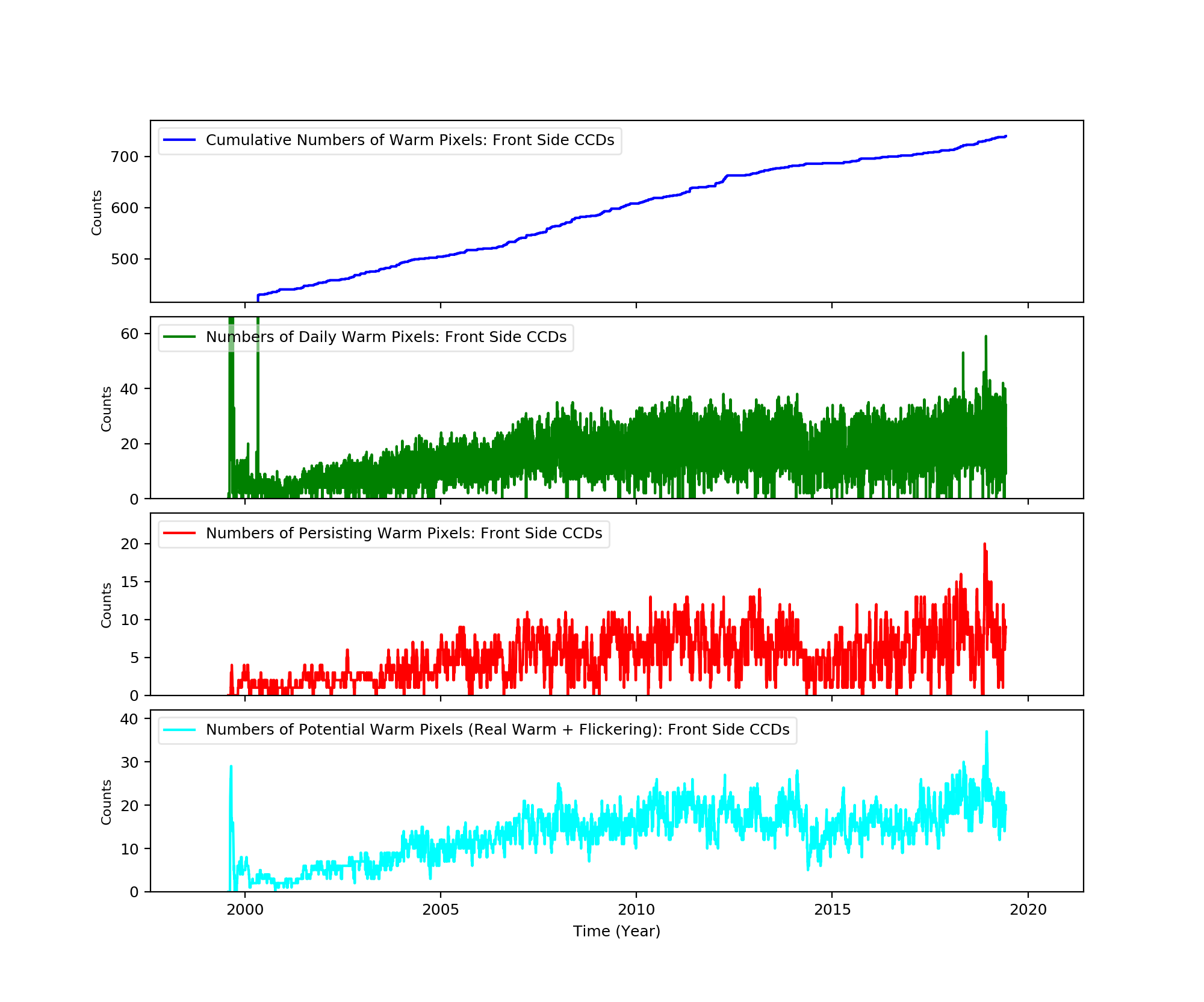The plots below were generated with a new warm pixel finding script. Please see Acis Bad Pixel Page for details.