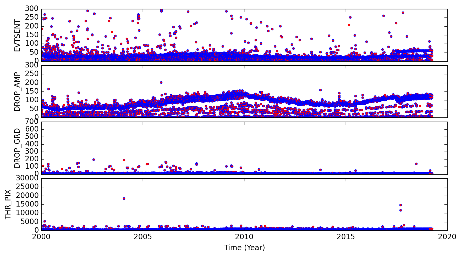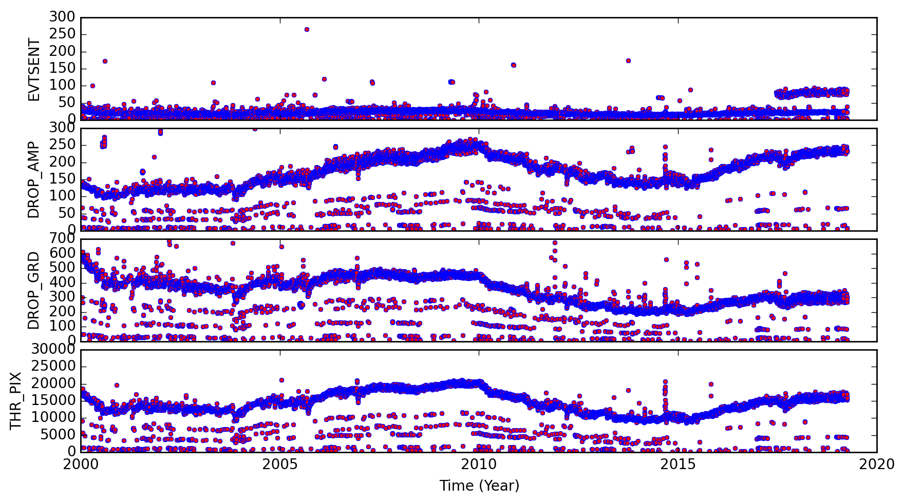 The links below are plots of stat1 quantities, showing on-board rejected events. The average EVTSENT, DROP_AMP, DROP_POS, DROP_GRD, THR_PIX, and maximum BERR_SUM obtained from L1 acis*stat1.fits files are plotted for each observation. CTI observations are plotted separately from regular science observations.