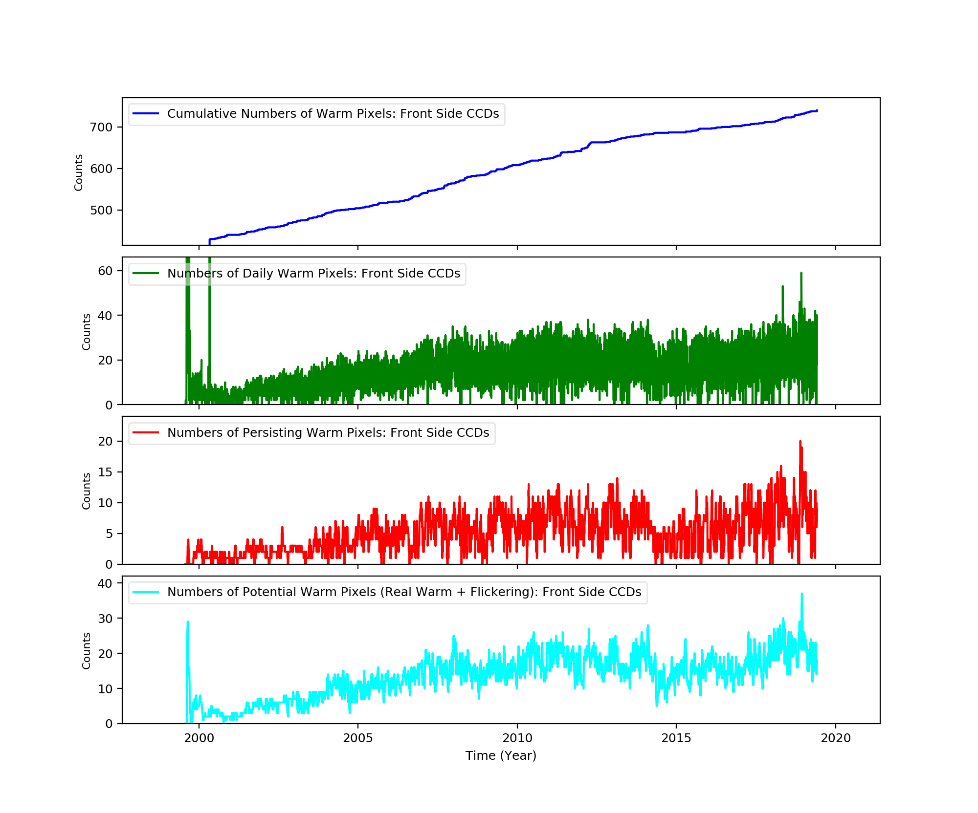 The plots below were generated with a new warm pixel finding script. Please see Acis Bad Pixel Page for details.