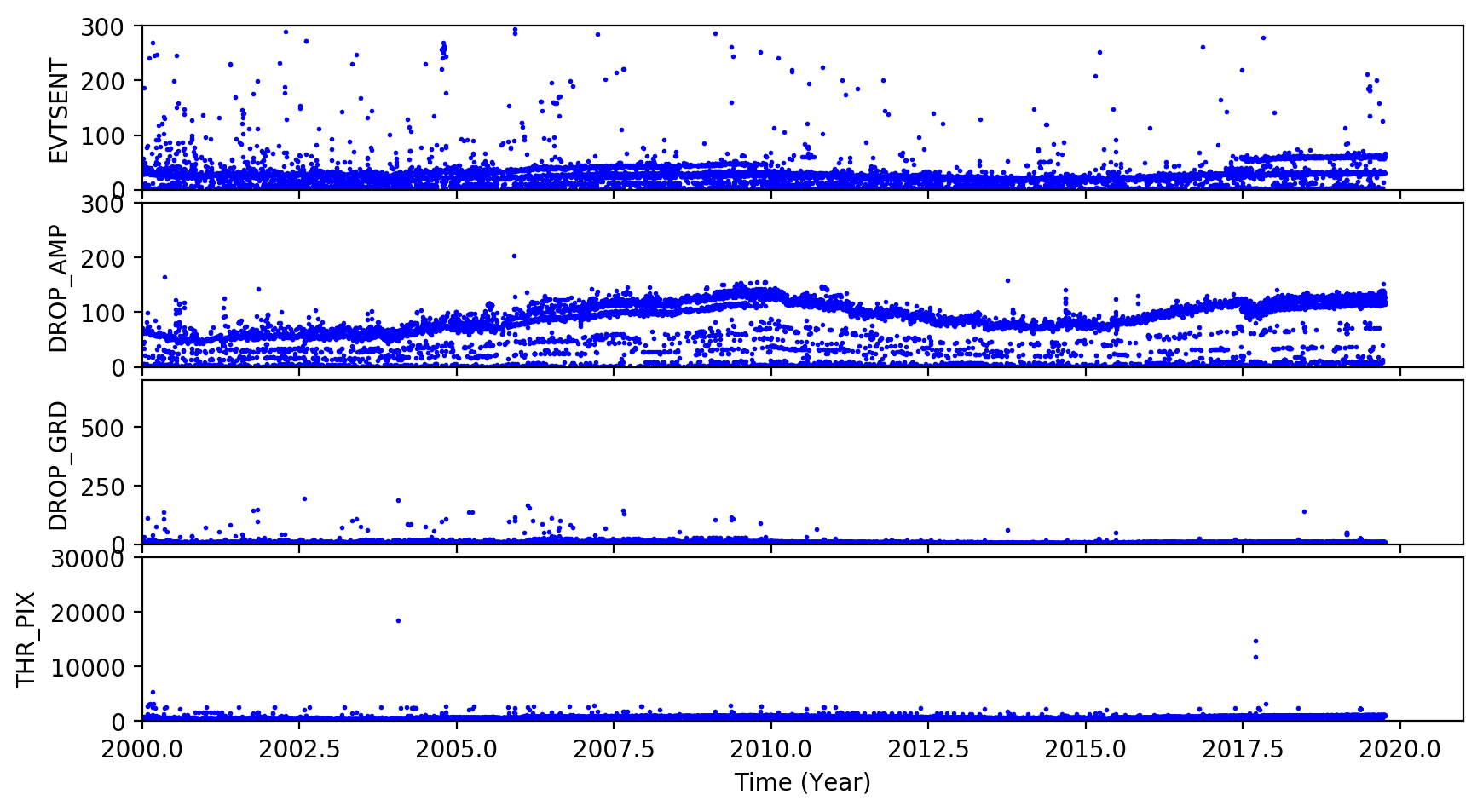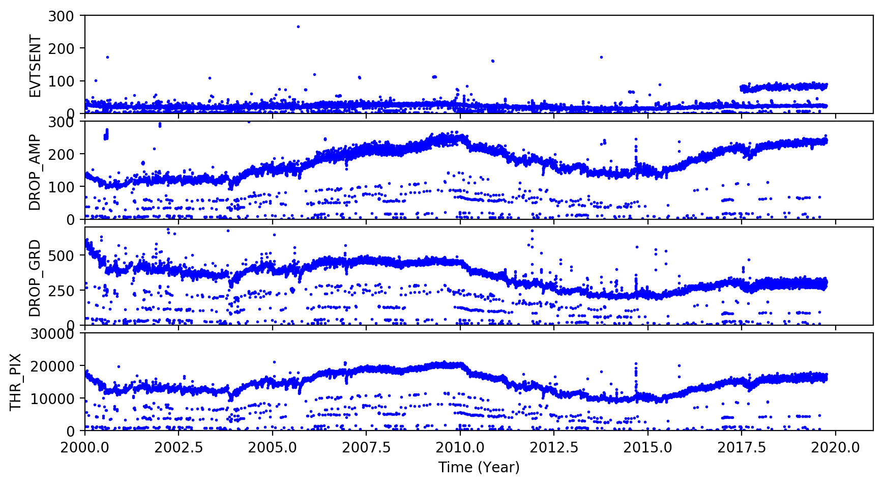 The links below are plots of stat1 quantities, showing on-board rejected events. The average EVTSENT, DROP_AMP, DROP_POS, DROP_GRD, THR_PIX, and maximum BERR_SUM obtained from L1 acis*stat1.fits files are plotted for each observation. CTI observations are plotted separately from regular science observations.