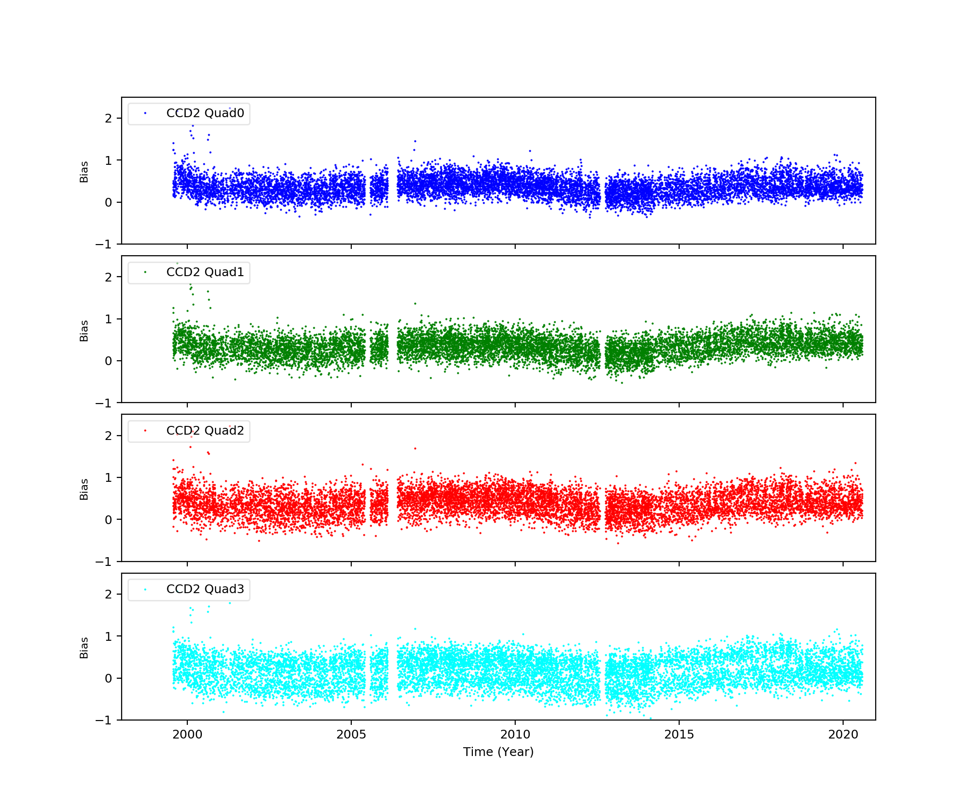 - Fits files were divided into 4 quads, then an average of bias level for each quad is computed. No corrections for dead spots, columns etc were included.