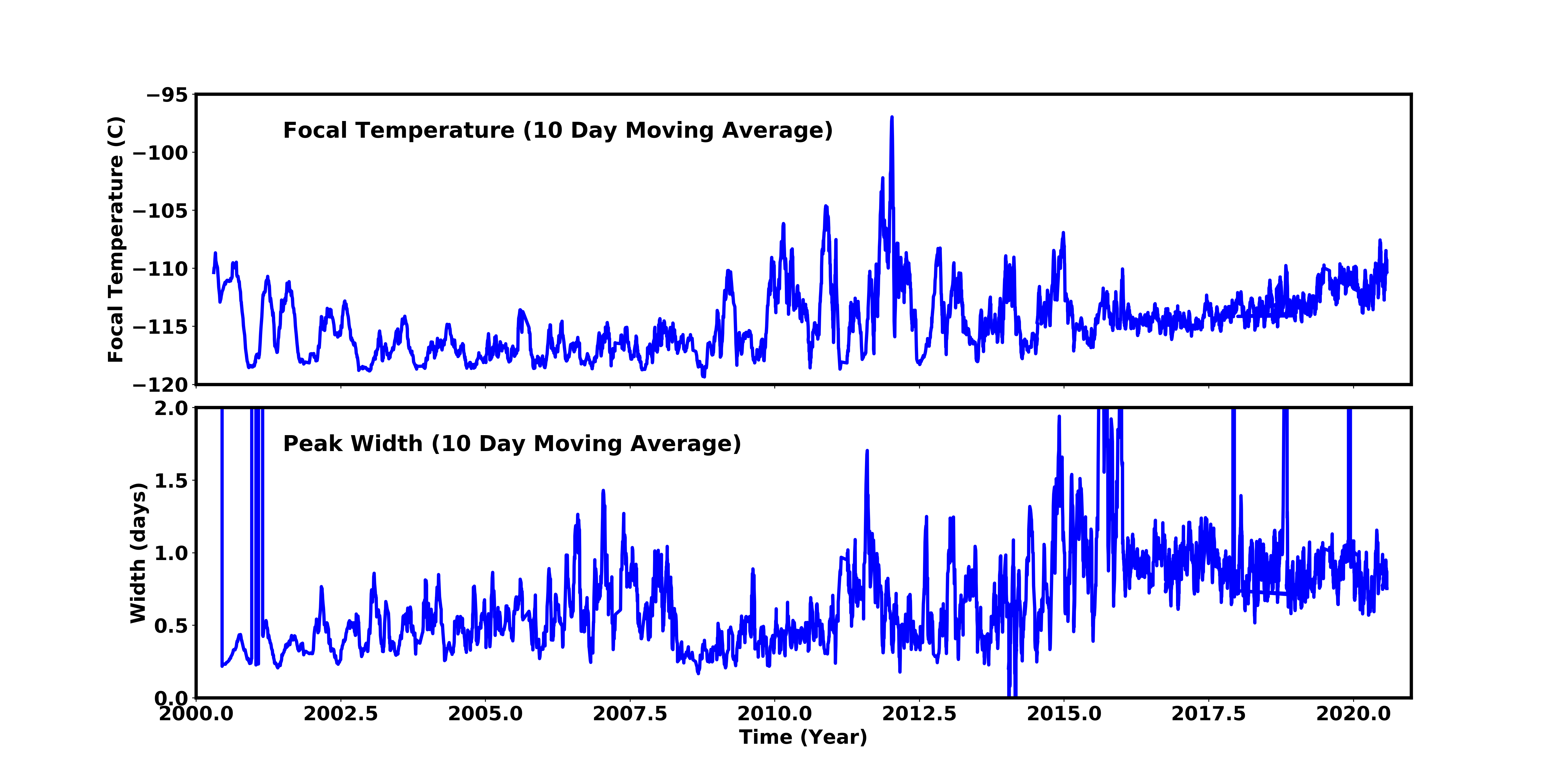 We are using 10 period moving averages to show trends of peak temperatures and peak widths. Note, the gaps in the width plot are due to missing/corrupted data.
