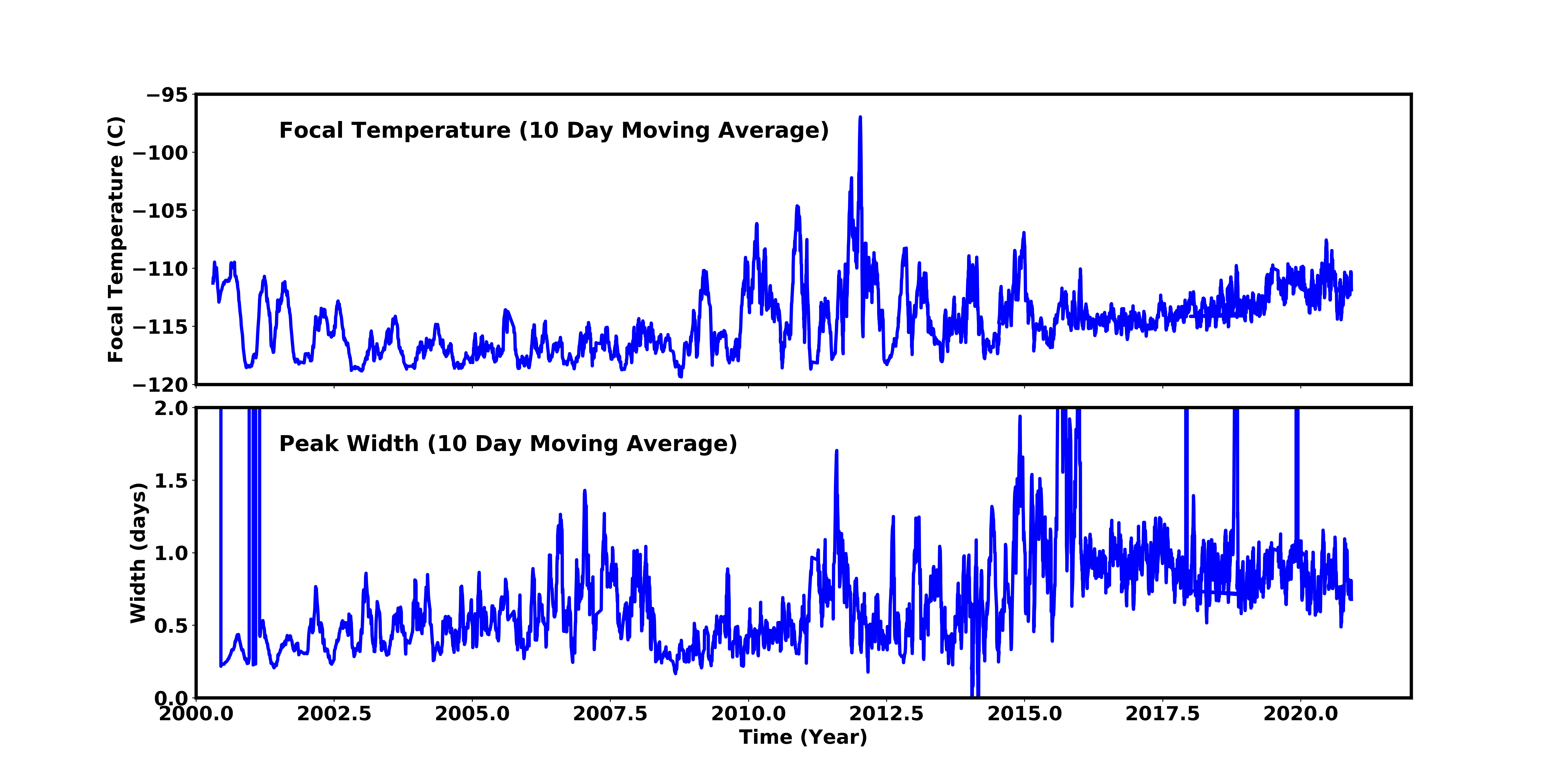 We are using 10 period moving averages to show trends of peak temperatures and peak widths. Note, the gaps in the width plot are due to missing/corrupted data.