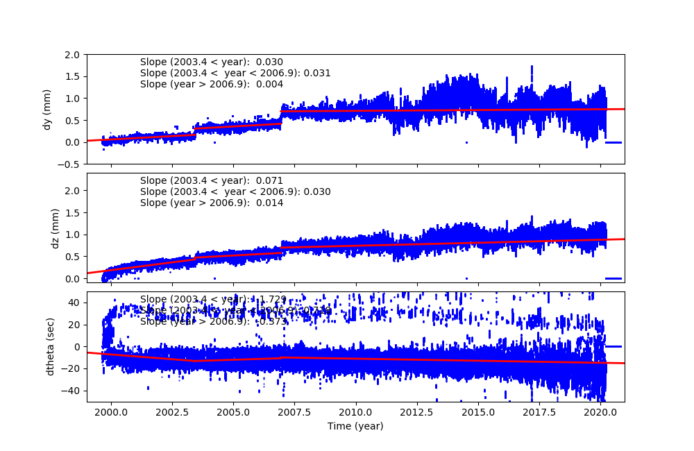 The sudden shift around DOM = 1400, 2700 and 4400 are due to fid light drift (see a memo by Aldcroft fiducial light drift). On the dtheta plot, two tracks are clearly observed. The track around 0.01 is due to HRC-I, and all others are clustered around -0.002. For more detail, please see SIM Shift and Twist Trend page