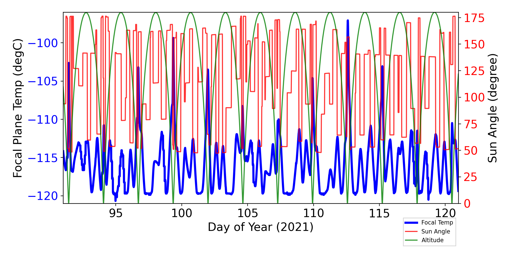 We are using 10 period moving averages to show trends of peak temperatures and peak widths. Note, the gaps in the width plot are due to missing/corrupted data.