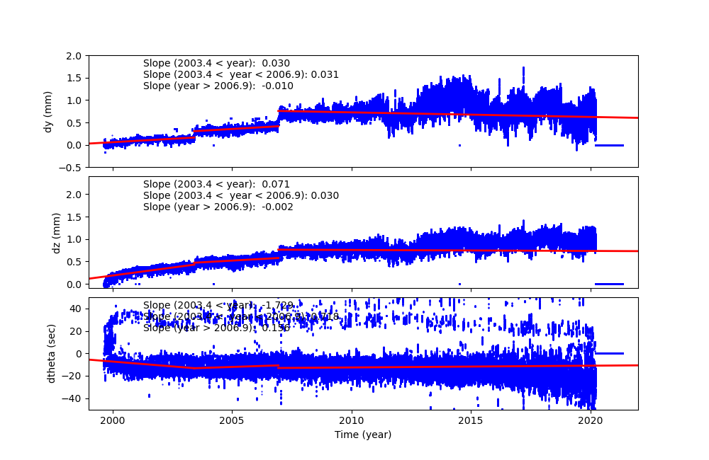 The sudden shift around DOM = 1400, 2700 and 4400 are due to fid light drift (see a memo by Aldcroft fiducial light drift). On the dtheta plot, two tracks are clearly observed. The track around 0.01 is due to HRC-I, and all others are clustered around -0.002. For more detail, please see SIM Shift and Twist Trend page