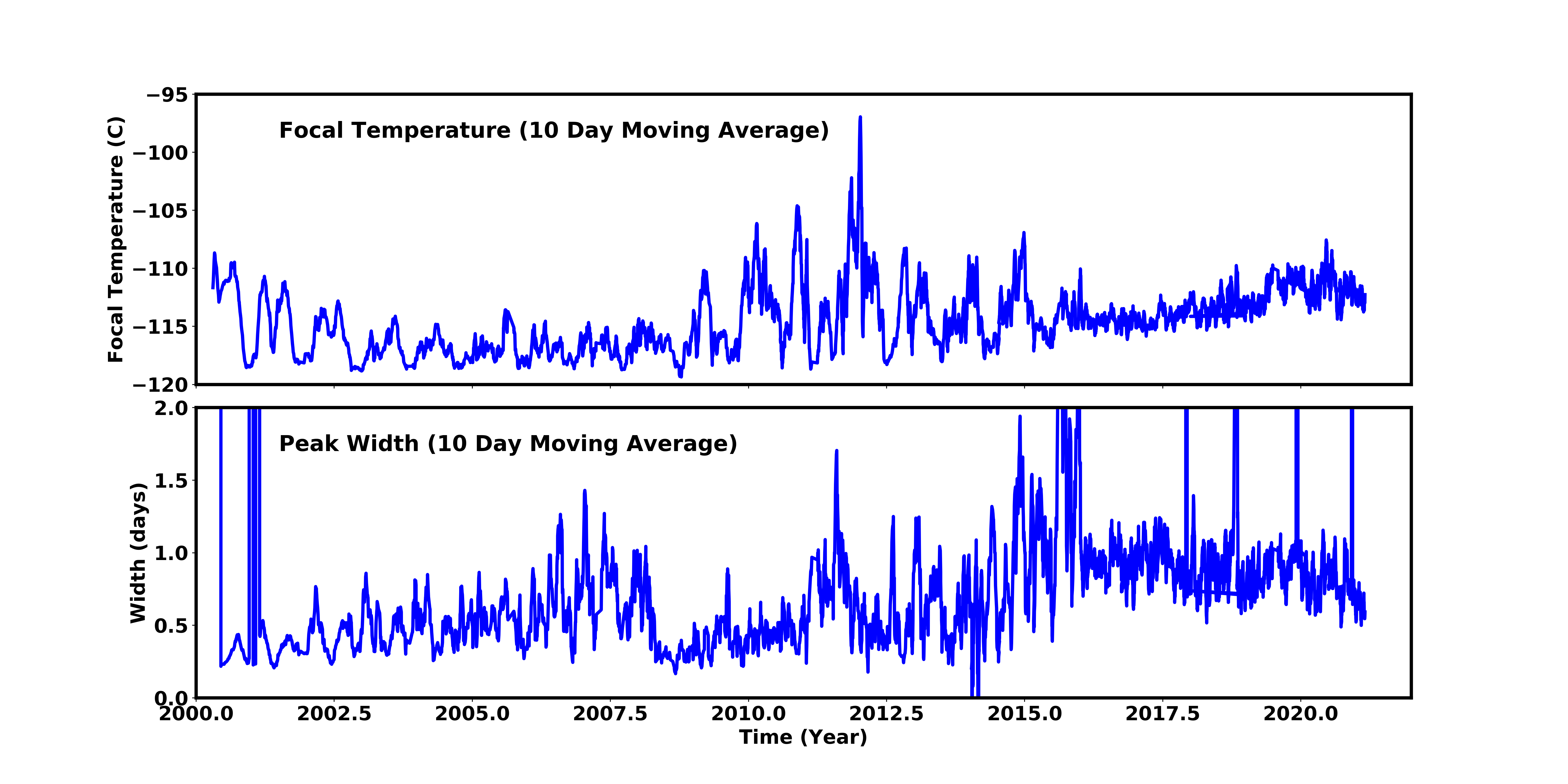 We are using 10 period moving averages to show trends of peak temperatures and peak widths. Note, the gaps in the width plot are due to missing/corrupted data.