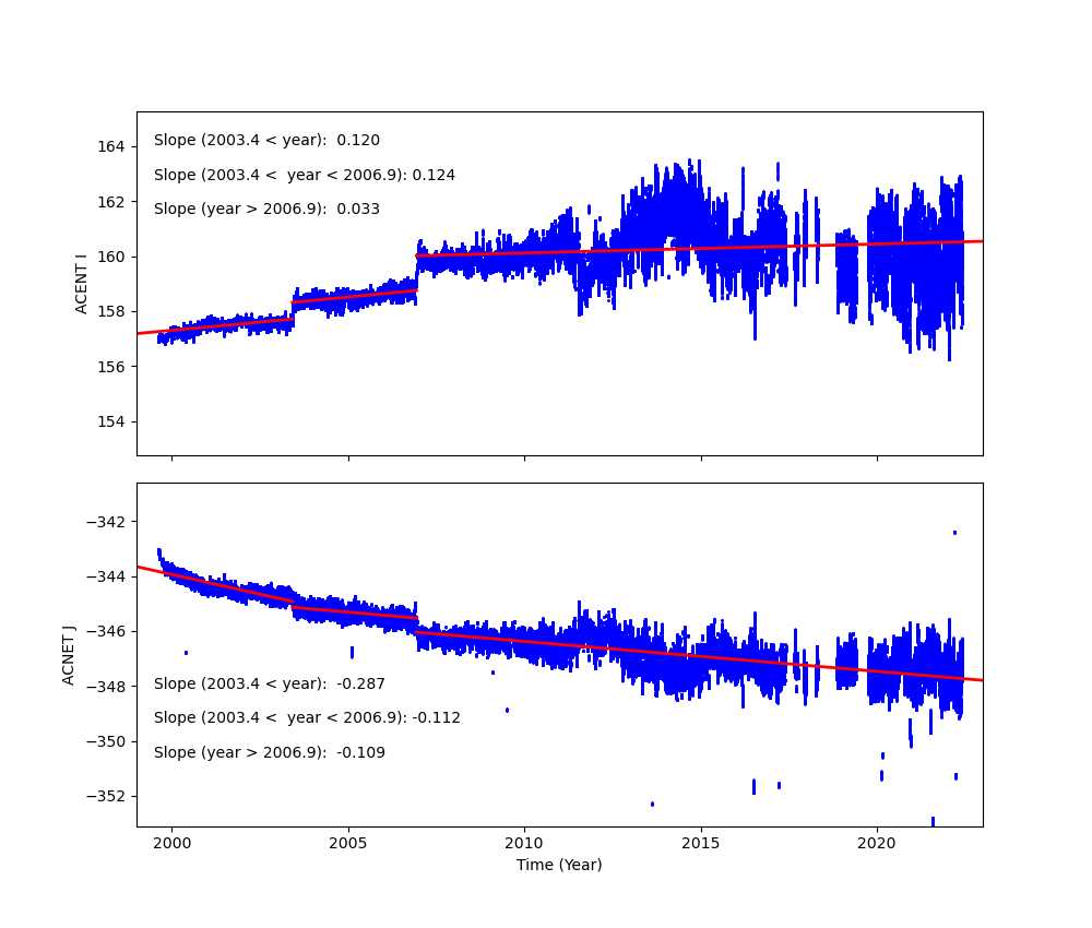 Fid light positions on ACA drift with time. The drift trends of Fid light 2 with ACIS-I and ACIS-S configurations are shown below.