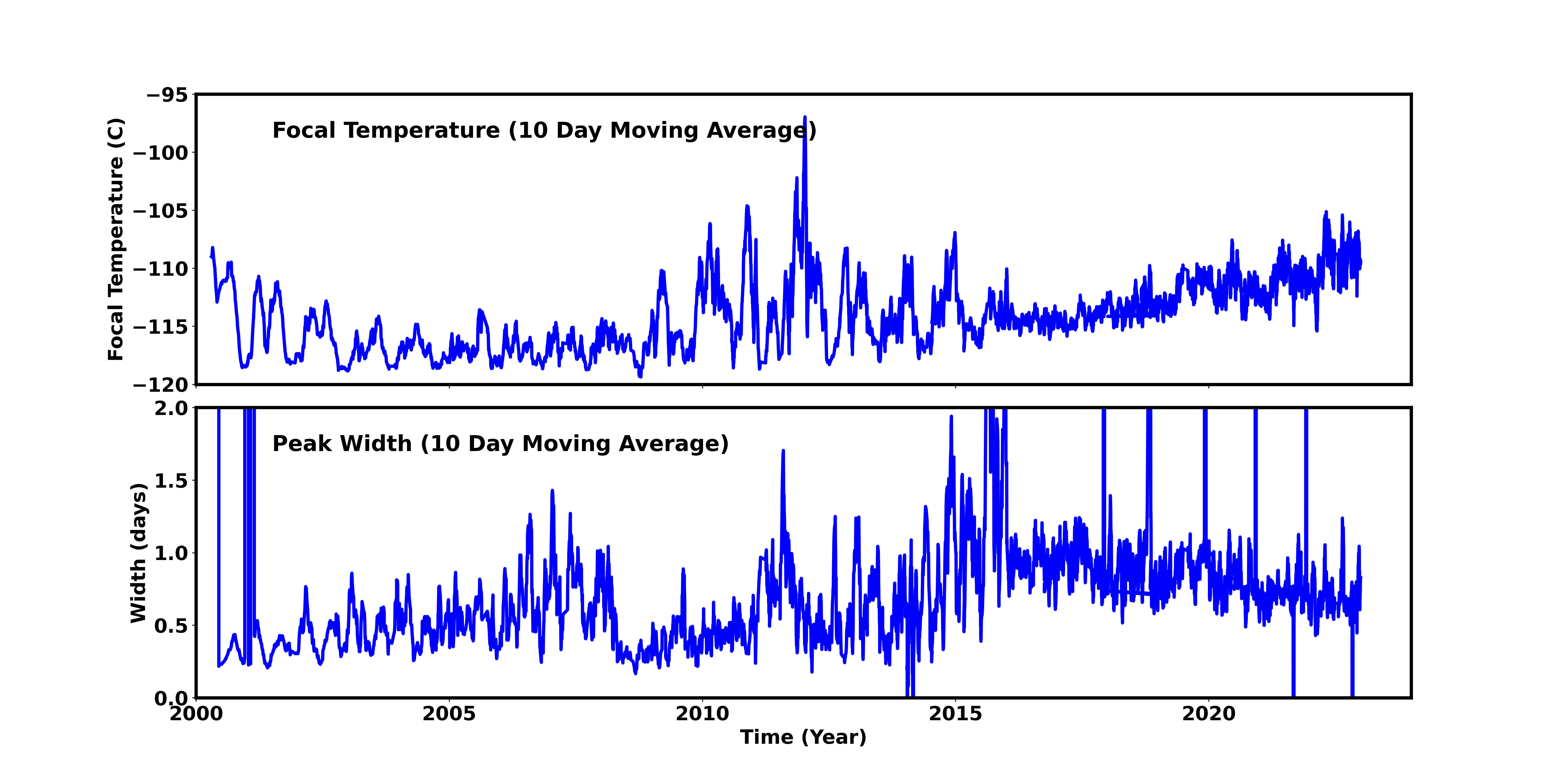 We are using 10 period moving averages to show trends of peak temperatures and peak widths. Note, the gaps in the width plot are due to missing/corrupted data.