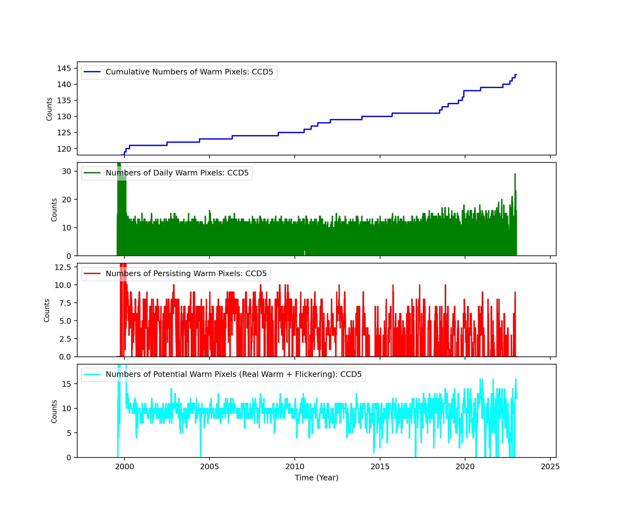 The plots below were generated with a new warm pixel finding script. Please see Acis Bad Pixel Page for details.