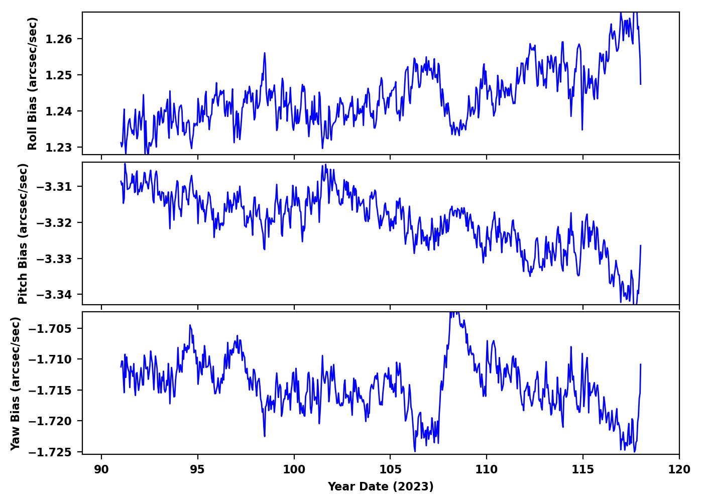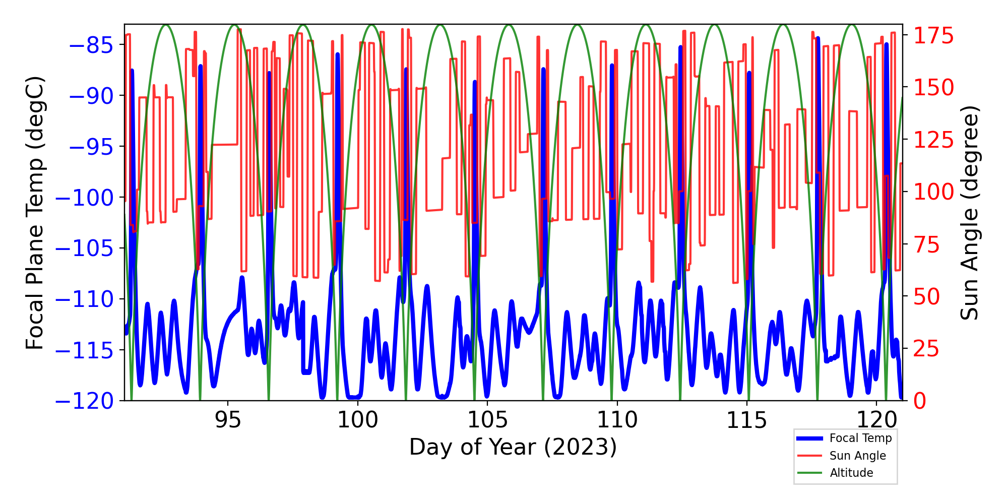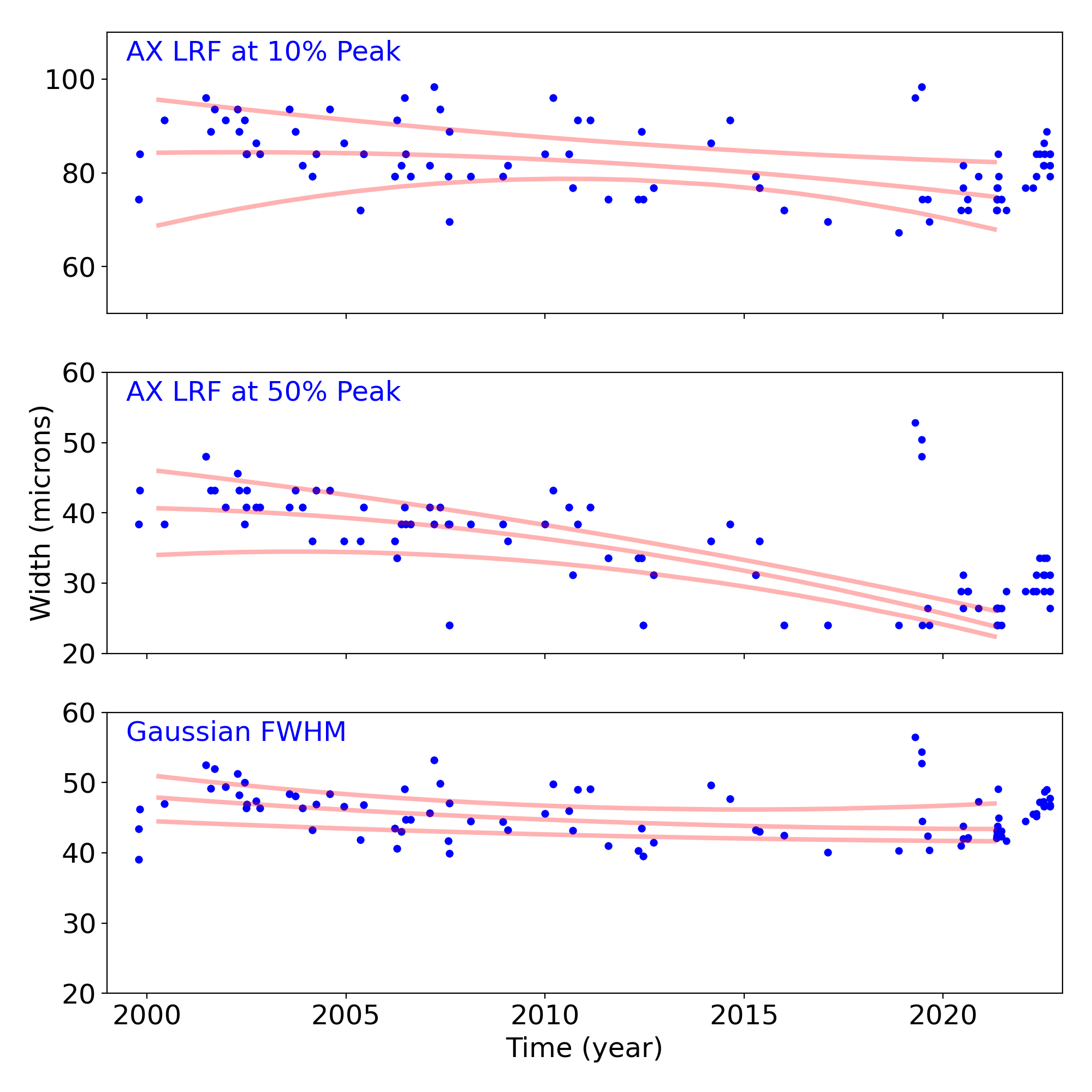 We are using 10 period moving averages to show trends of peak temperatures and peak widths. Note, the gaps in the width plot are due to missing/corrupted data.