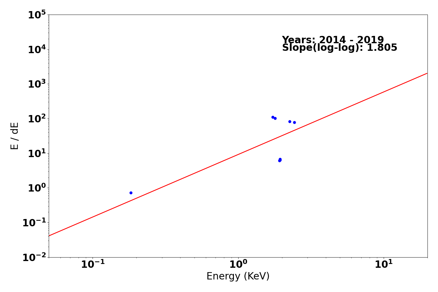 - The exposure map is opened with ds9, and check a distribution of count rates against energy. From this, estimate the upper threshold value. Any events beyond this upper threshold are assumed erroneous events such as bad pixels.