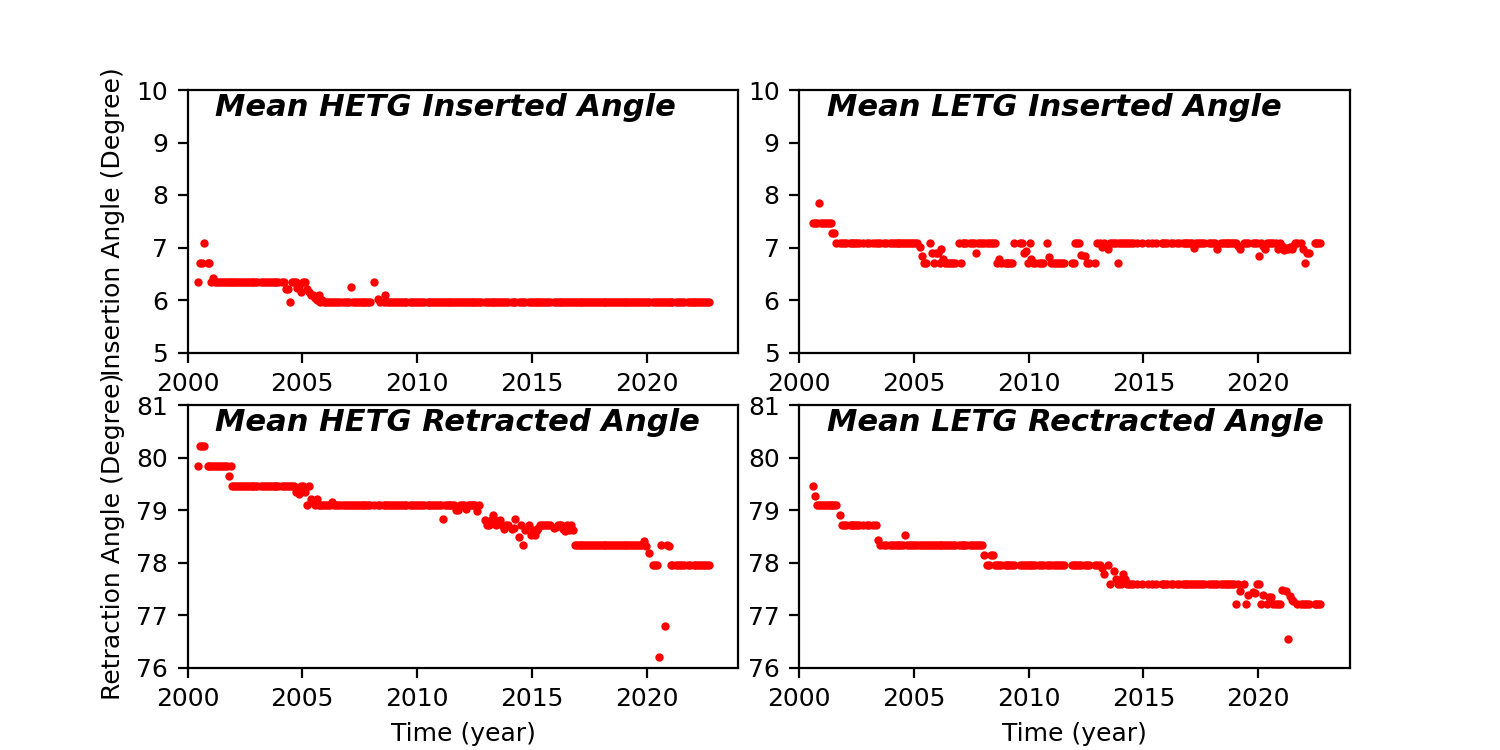We plot the width of the zero order streak of ACIS/HETG observations and the width of the zero order image for HRC/LETG observations of point sources. No significant defocusing trend is seen at this time. See Gratings Trends pages.