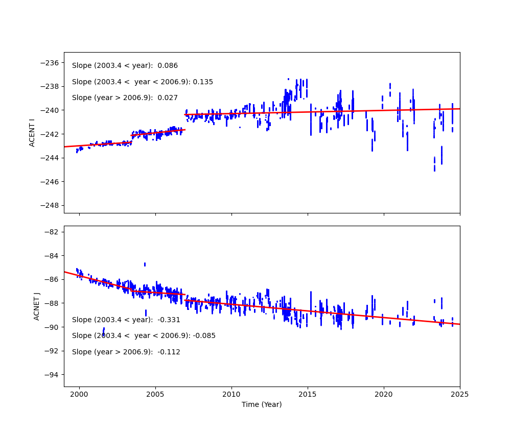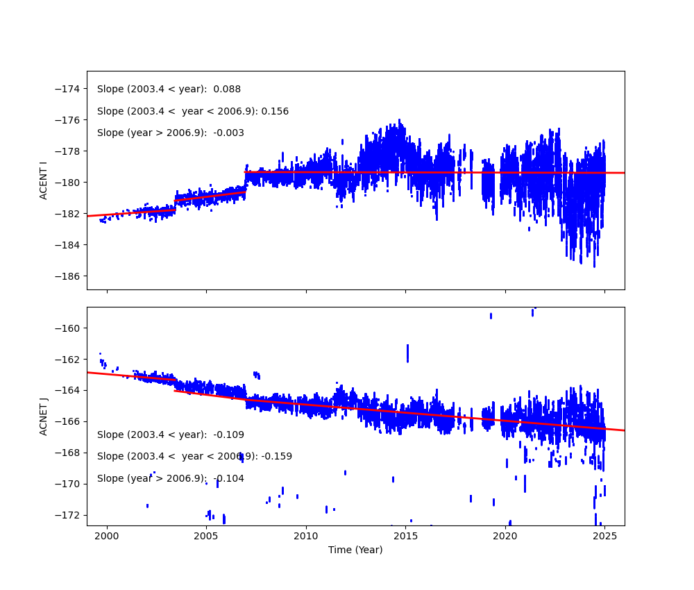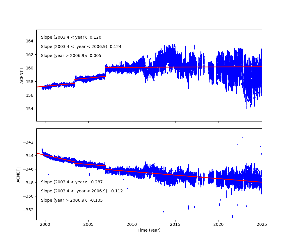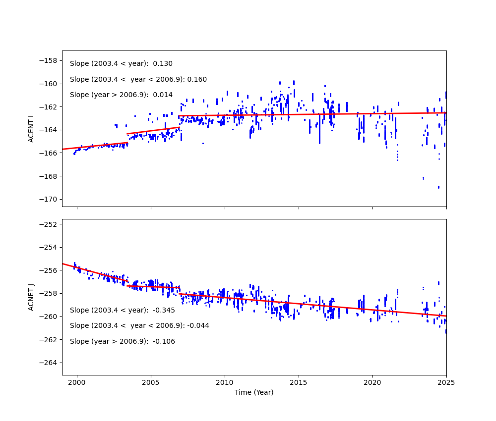 Fid light positions on ACA drift with time. The drift trends of Fid light 2 with ACIS-I and ACIS-S configurations are shown below.