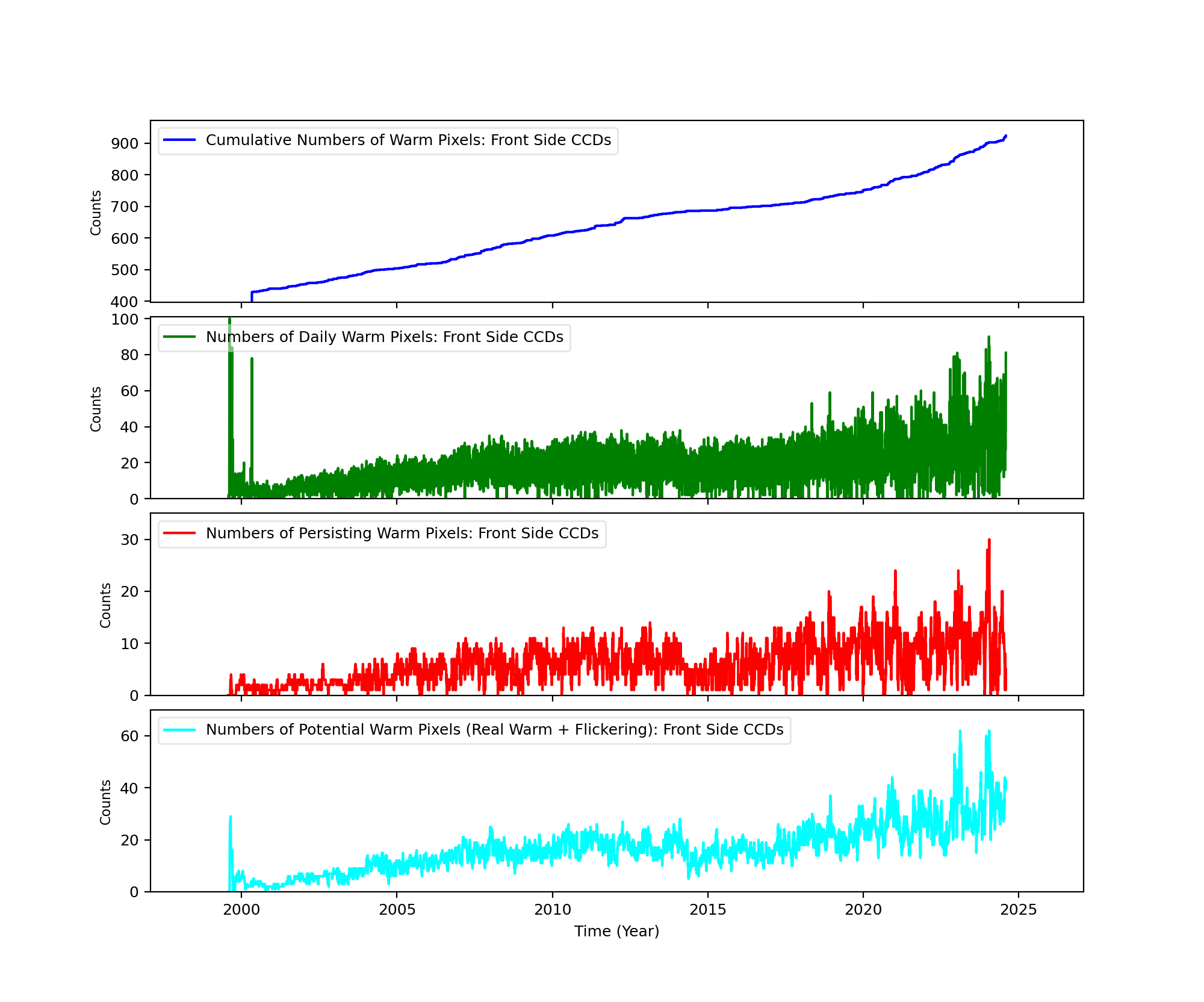 The plots below were generated with a new warm pixel finding script. Please see Acis Bad Pixel Page for details.