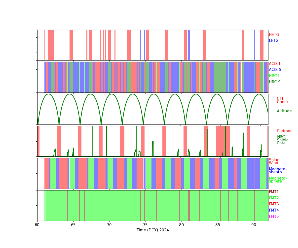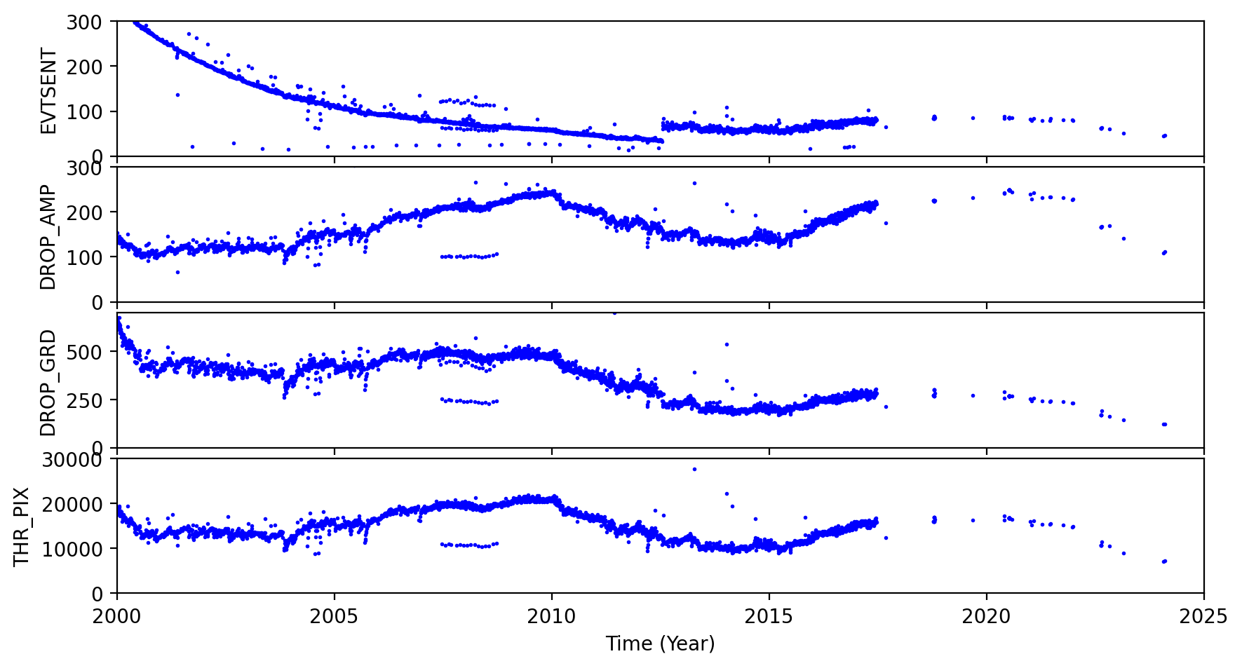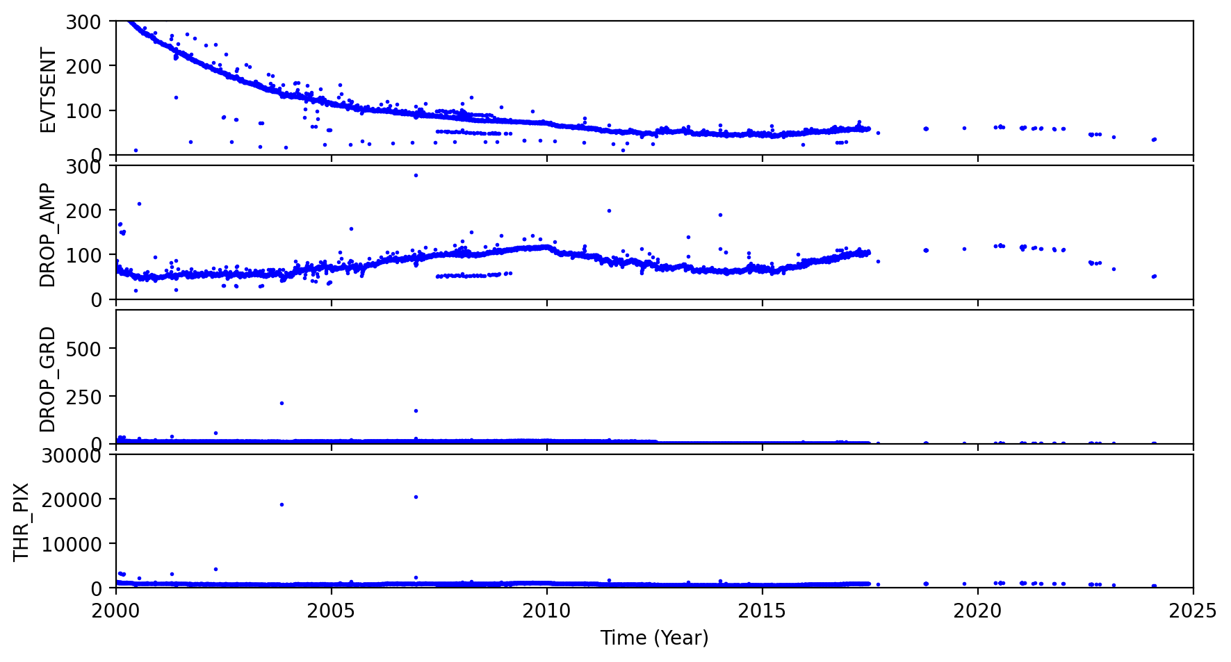 The links below are plots of stat1 quantities, showing on-board rejected events. The average EVTSENT, DROP_AMP, DROP_POS, DROP_GRD, THR_PIX, and maximum BERR_SUM obtained from L1 acis*stat1.fits files are plotted for each observation. CTI observations are plotted separately from regular science observations.