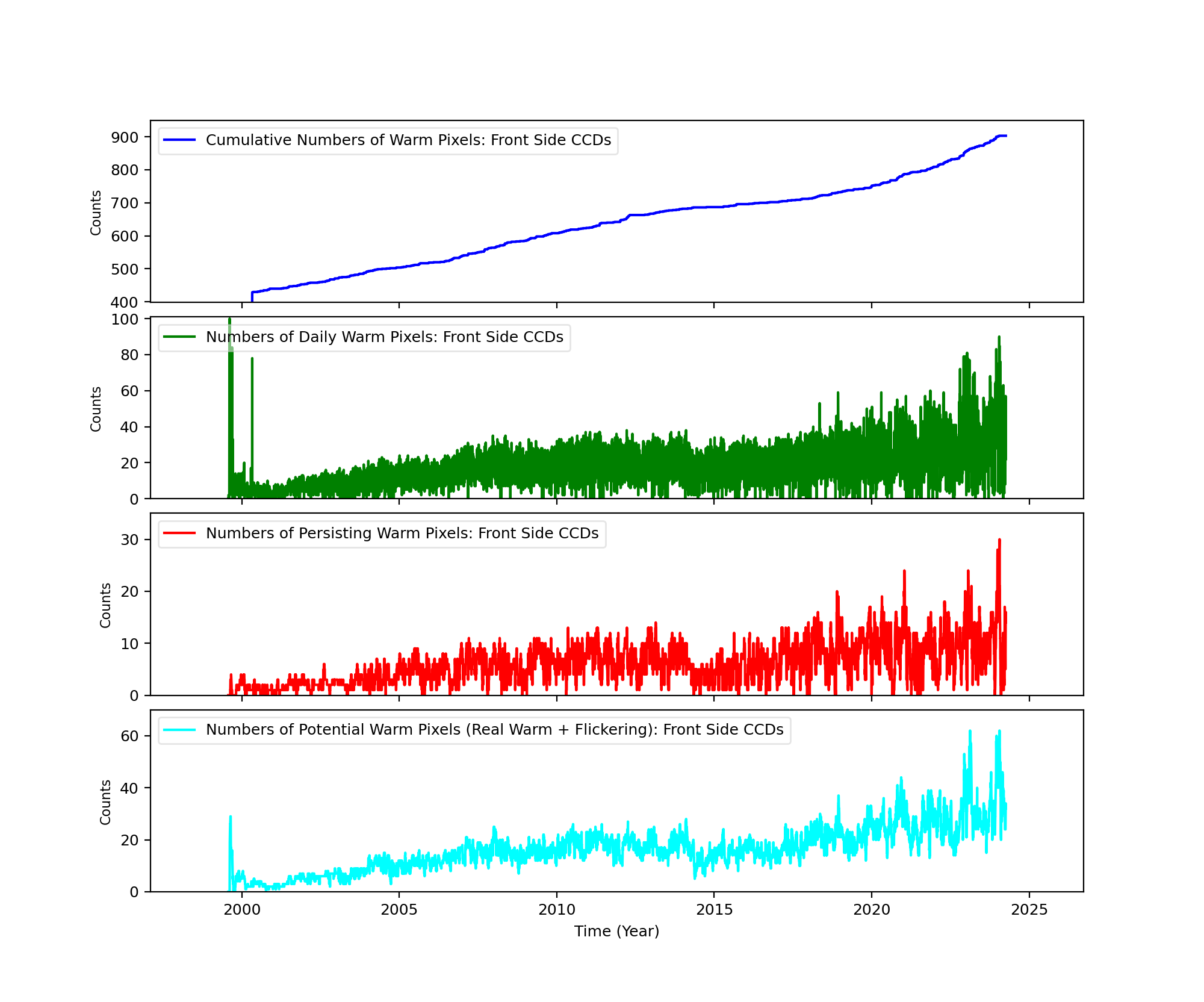 The plots below were generated with a new warm pixel finding script. Please see Acis Bad Pixel Page for details.