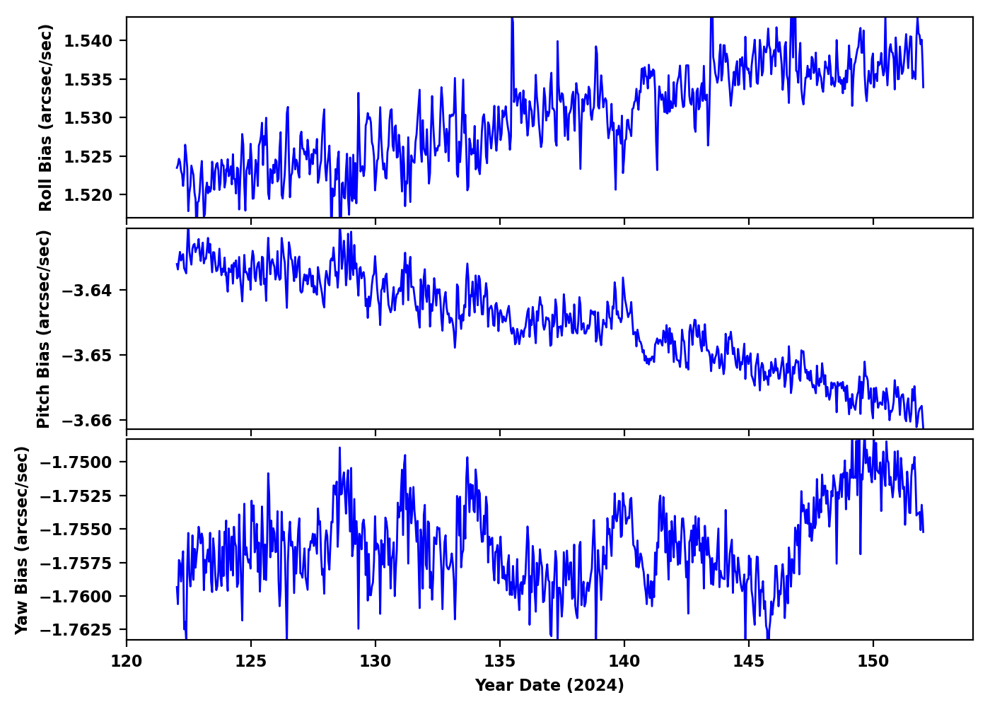 We are using 10 period moving averages to show trends of peak temperatures and peak widths. Note, the gaps in the width plot are due to missing/corrupted data.