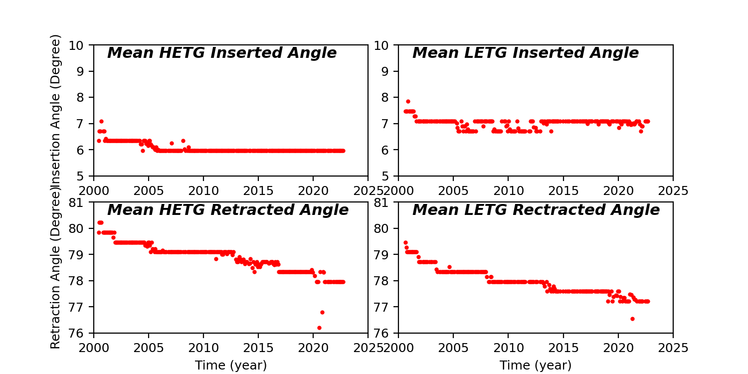 We plot the width of the zero order streak of ACIS/HETG observations and the width of the zero order image for HRC/LETG observations of point sources. No significant defocusing trend is seen at this time. See Gratings Trends pages.