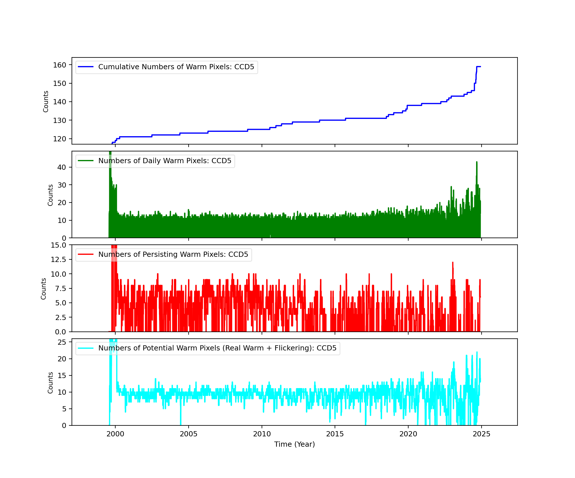 The plots below were generated with a new warm pixel finding script. Please see Acis Bad Pixel Page for details.