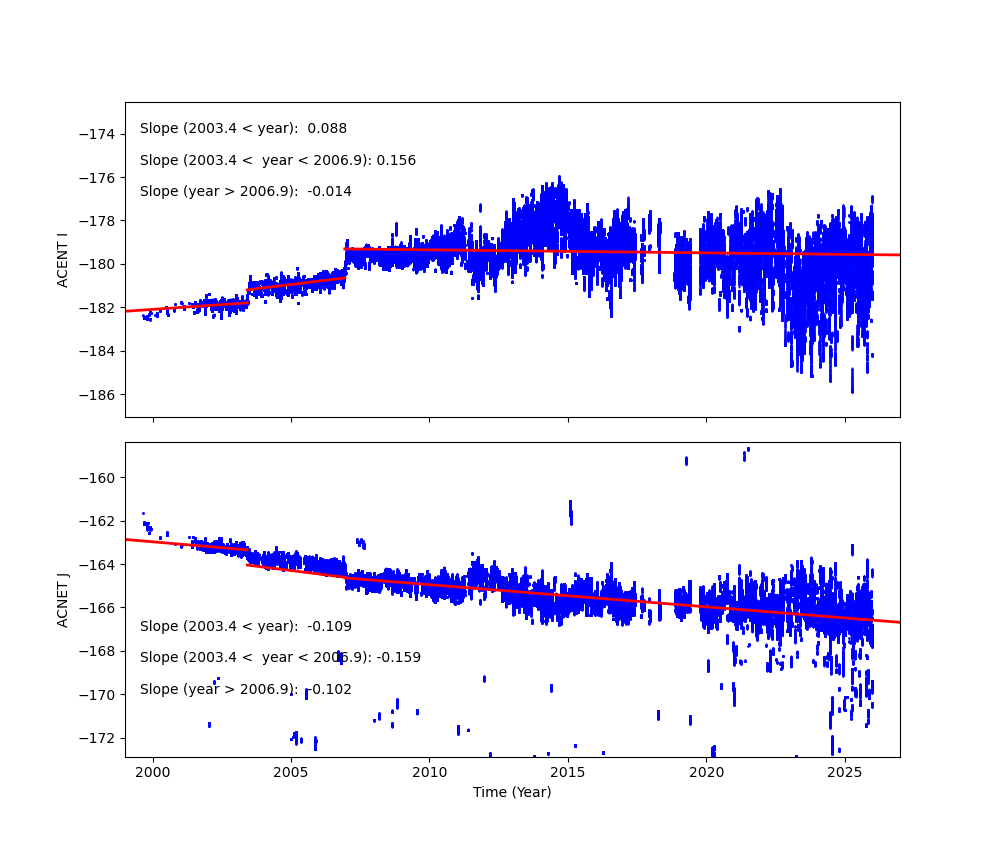 Fid light positions on ACA drift with time. The drift trends of Fid light 2 with ACIS-I and ACIS-S configurations are shown below.