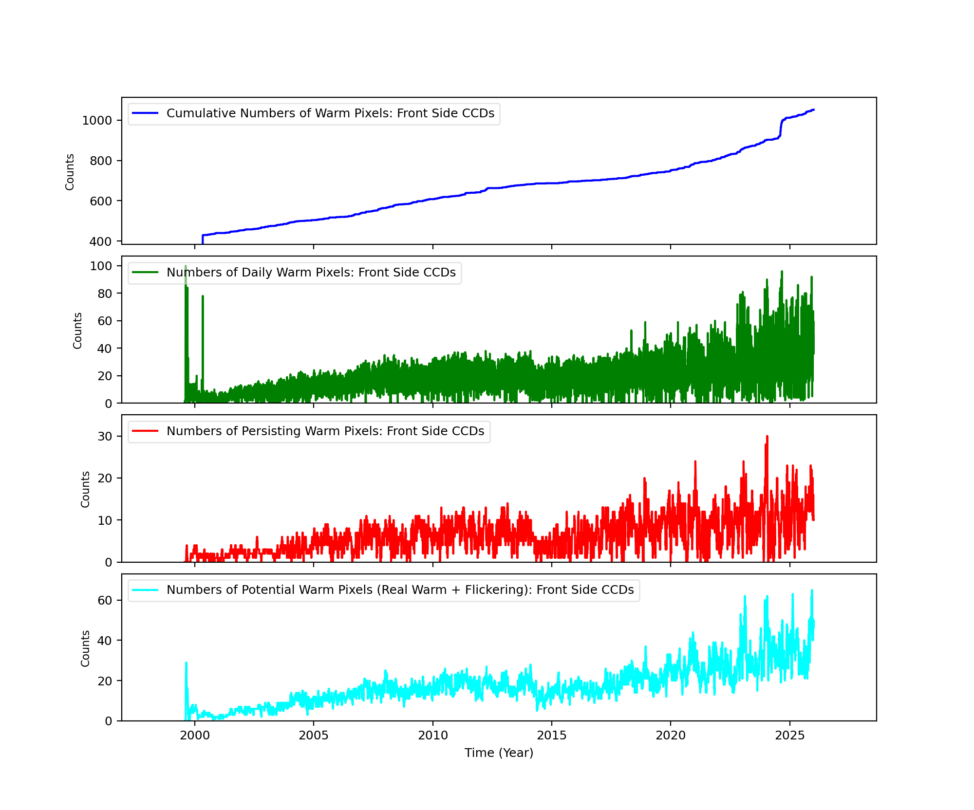 The plots below were generated with a new warm pixel finding script. Please see Acis Bad Pixel Page for details.