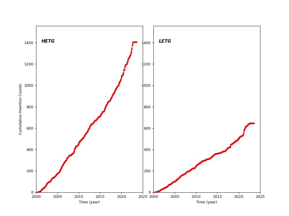 We plot the width of the zero order streak of ACIS/HETG observations and the width of the zero order image for HRC/LETG observations of point sources. No significant defocusing trend is seen at this time. See Gratings Trends pages.