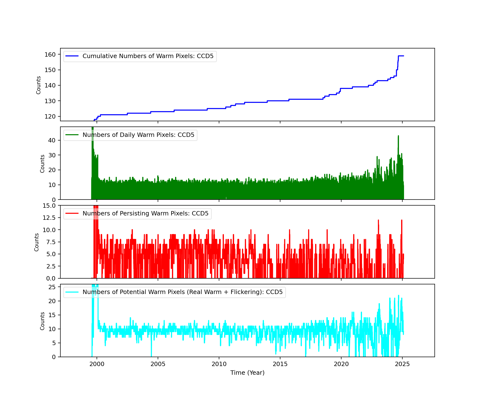 The plots below were generated with a new warm pixel finding script. Please see Acis Bad Pixel Page for details.