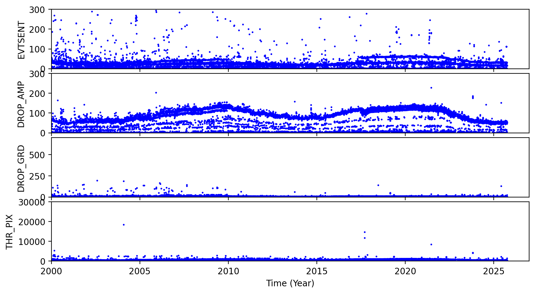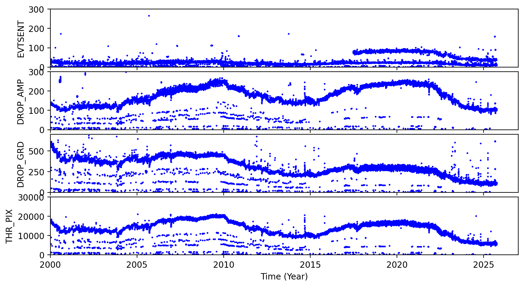 The links below are plots of stat1 quantities, showing on-board rejected events. The average EVTSENT, DROP_AMP, DROP_POS, DROP_GRD, THR_PIX, and maximum BERR_SUM obtained from L1 acis*stat1.fits files are plotted for each observation. CTI observations are plotted separately from regular science observations.