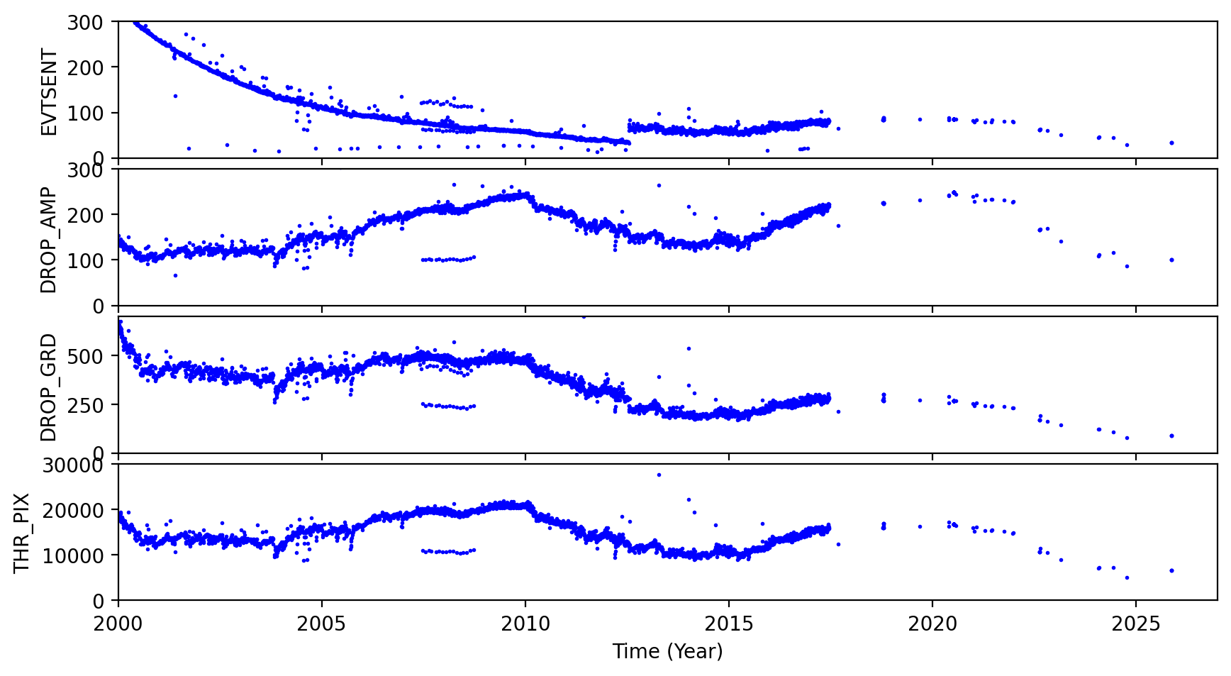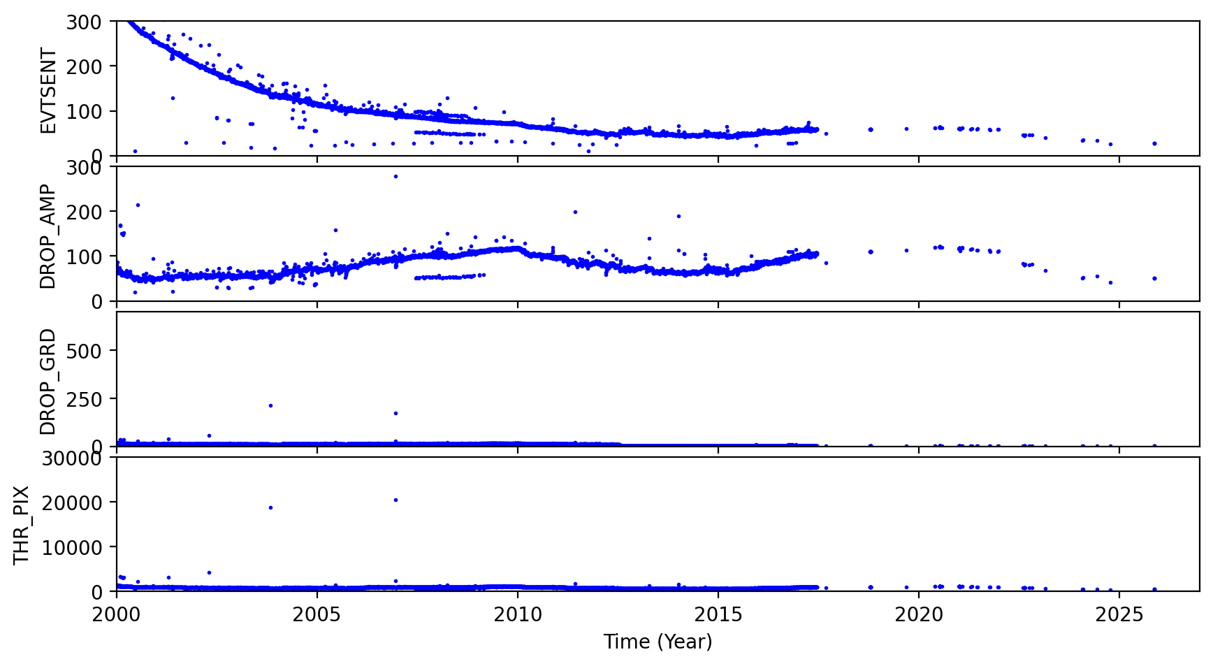 The links below are plots of stat1 quantities, showing on-board rejected events. The average EVTSENT, DROP_AMP, DROP_POS, DROP_GRD, THR_PIX, and maximum BERR_SUM obtained from L1 acis*stat1.fits files are plotted for each observation. CTI observations are plotted separately from regular science observations.