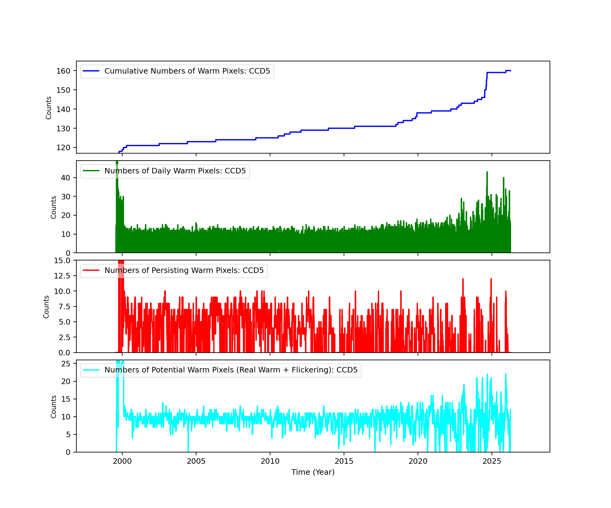 The plots below were generated with a new warm pixel finding script. Please see Acis Bad Pixel Page for details.