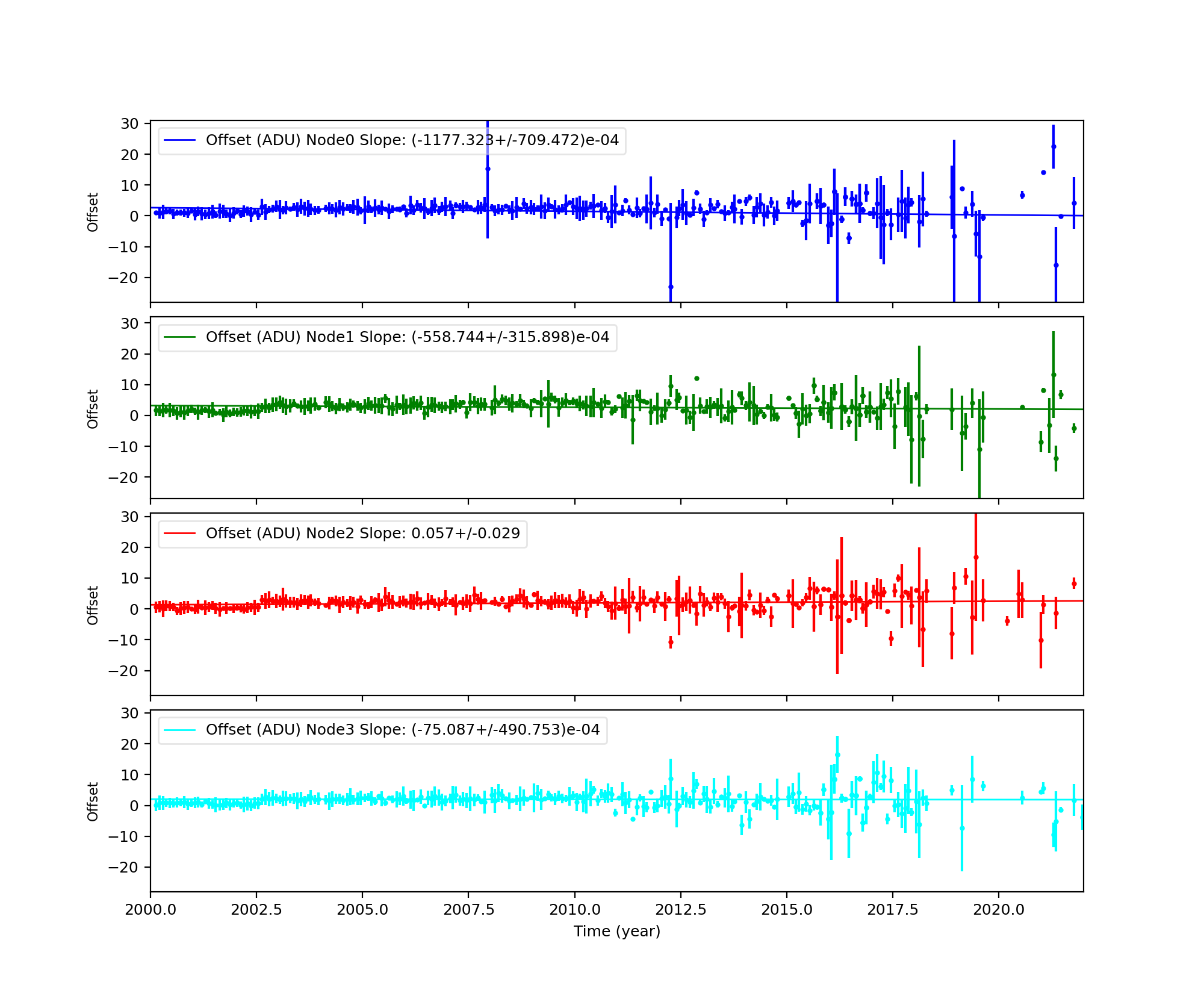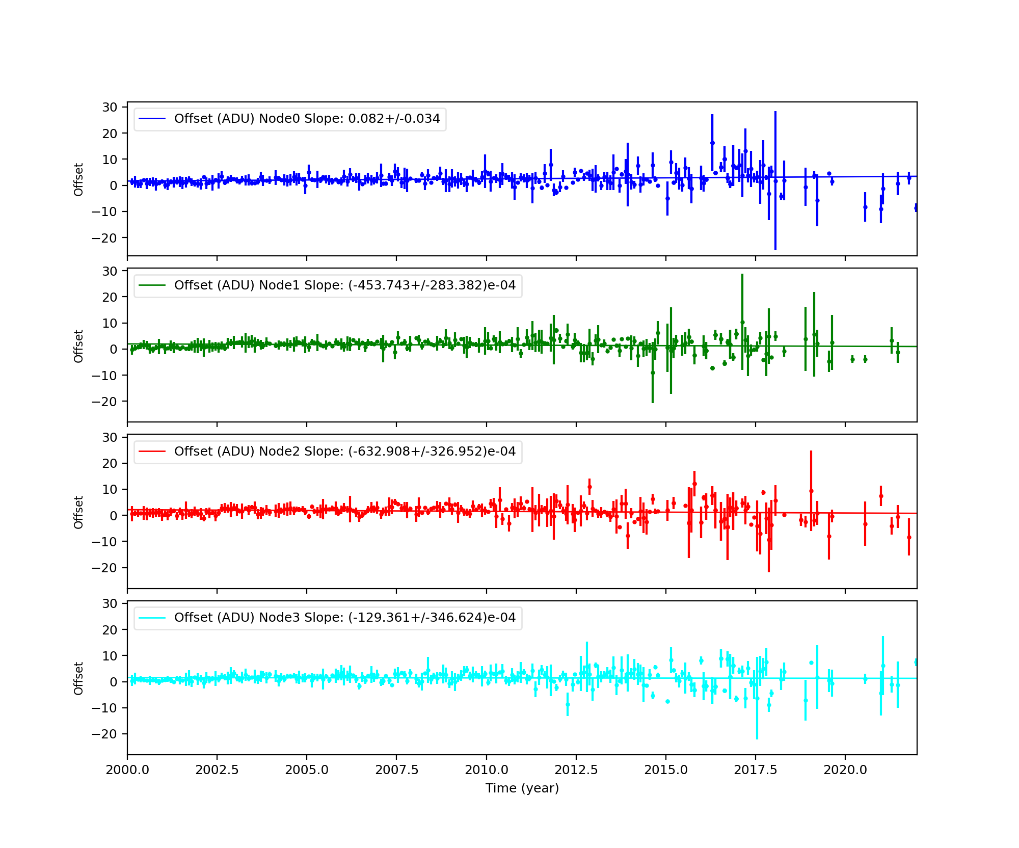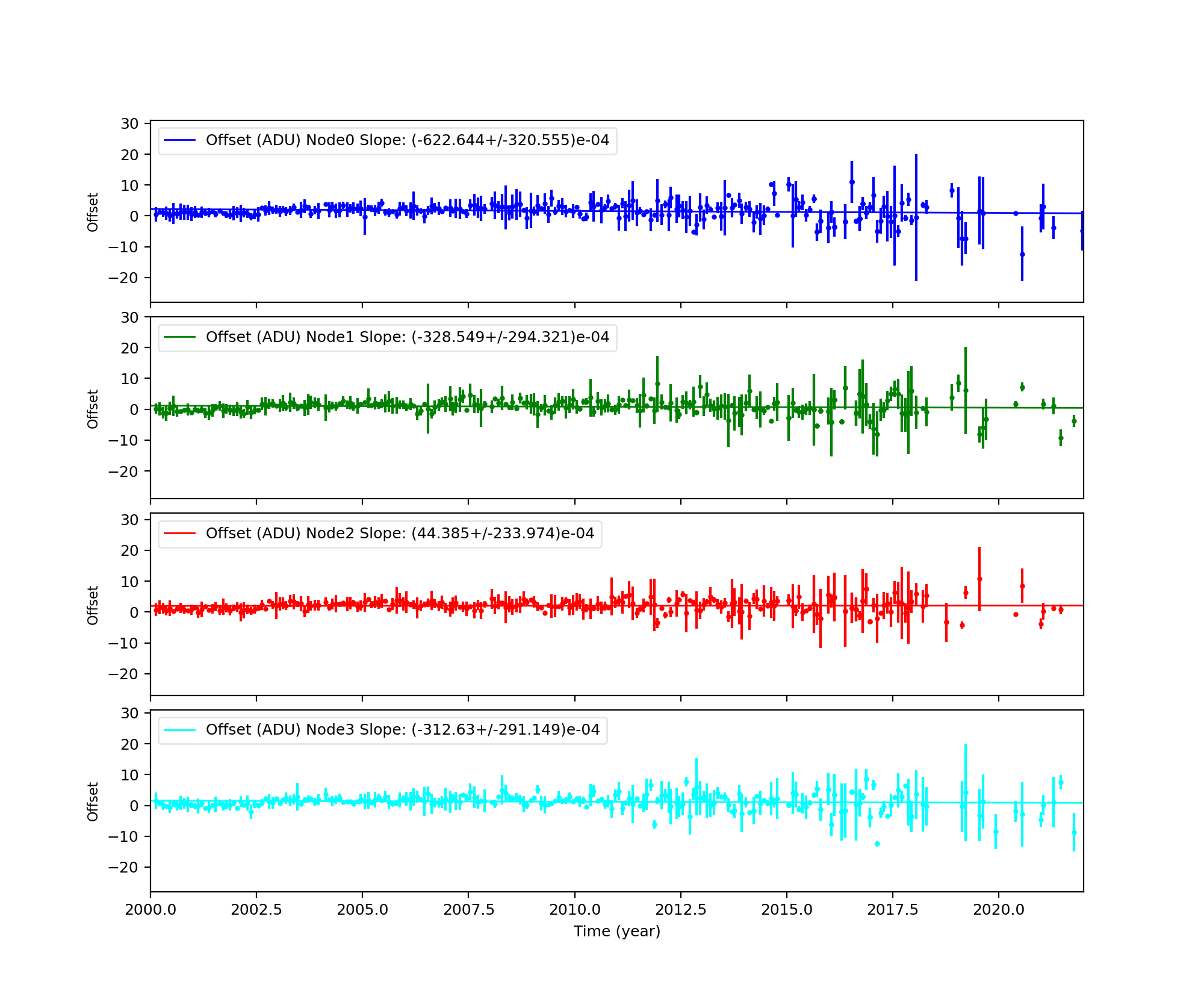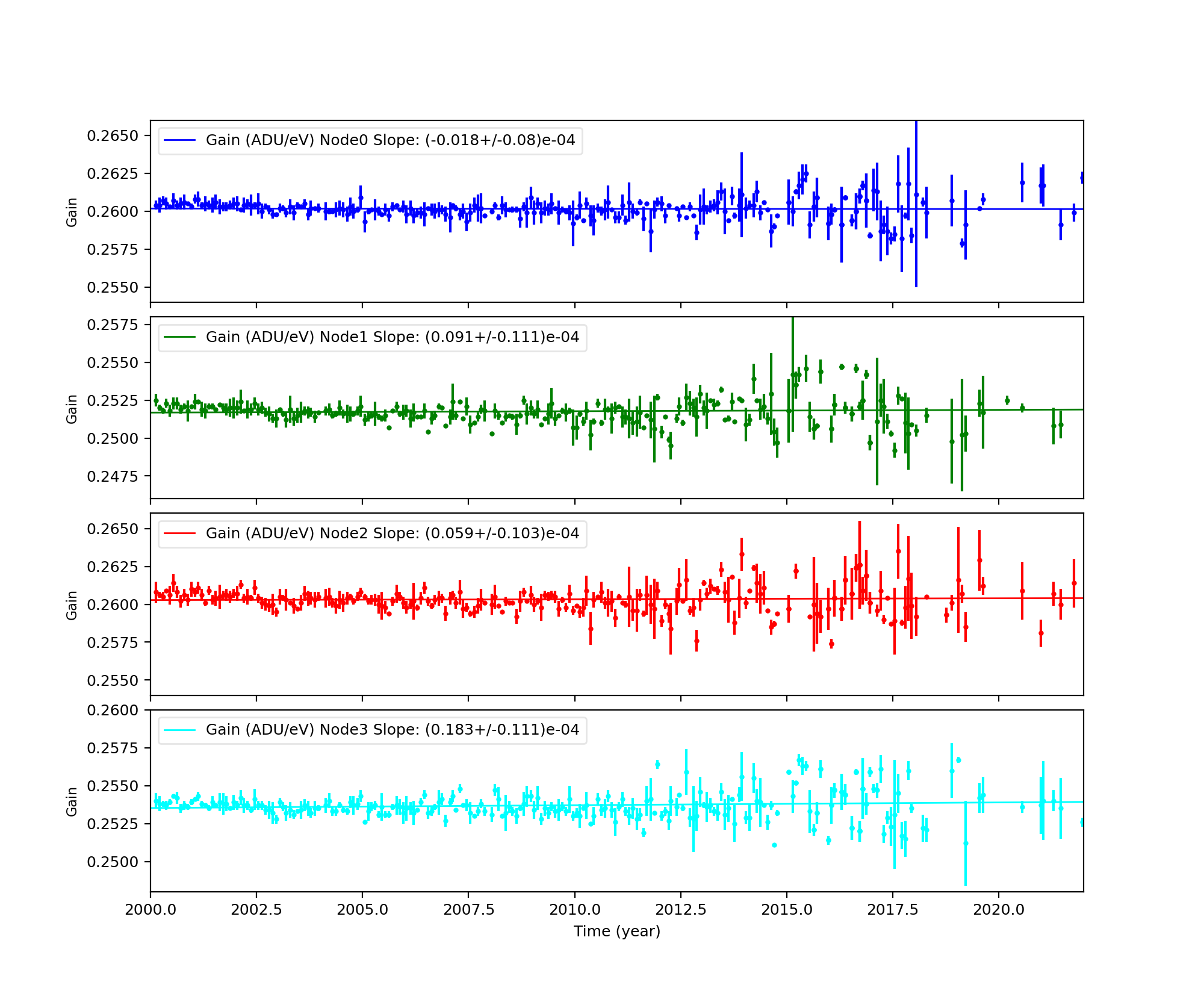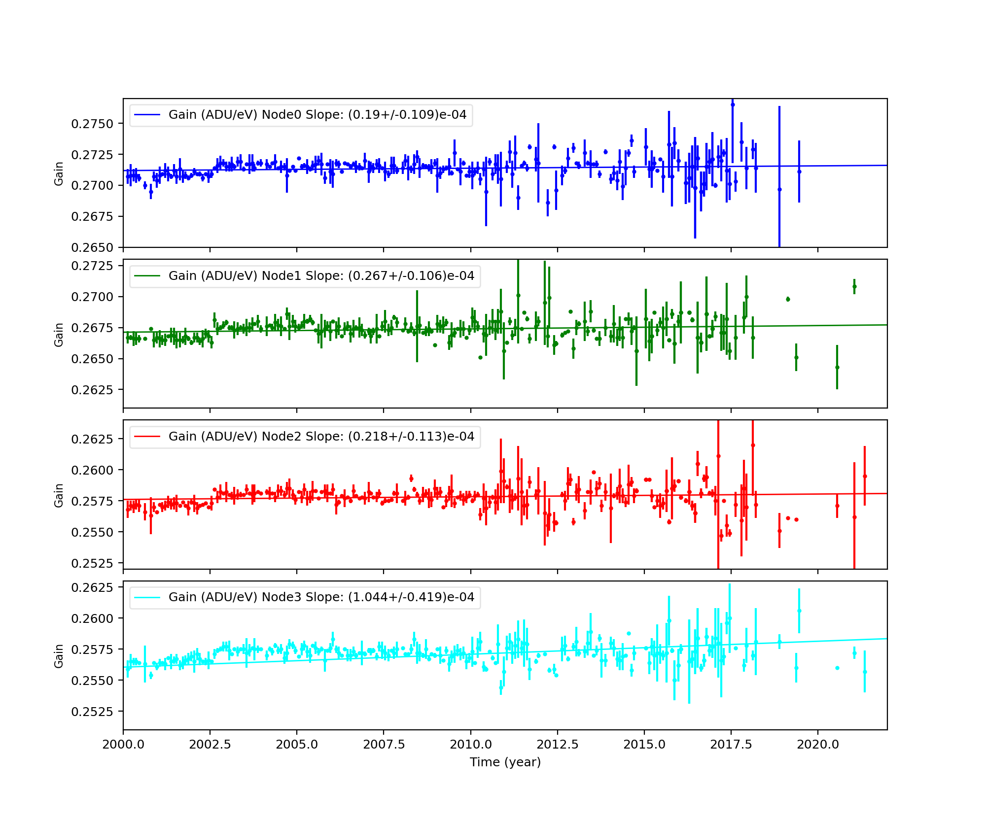 The x axis is in year, and y axis is in ADU/eV for gain plots, and in ADU for offset plots. The slopes are either ADU/eV per year, or ADU per year. Click a plot to enlange it.