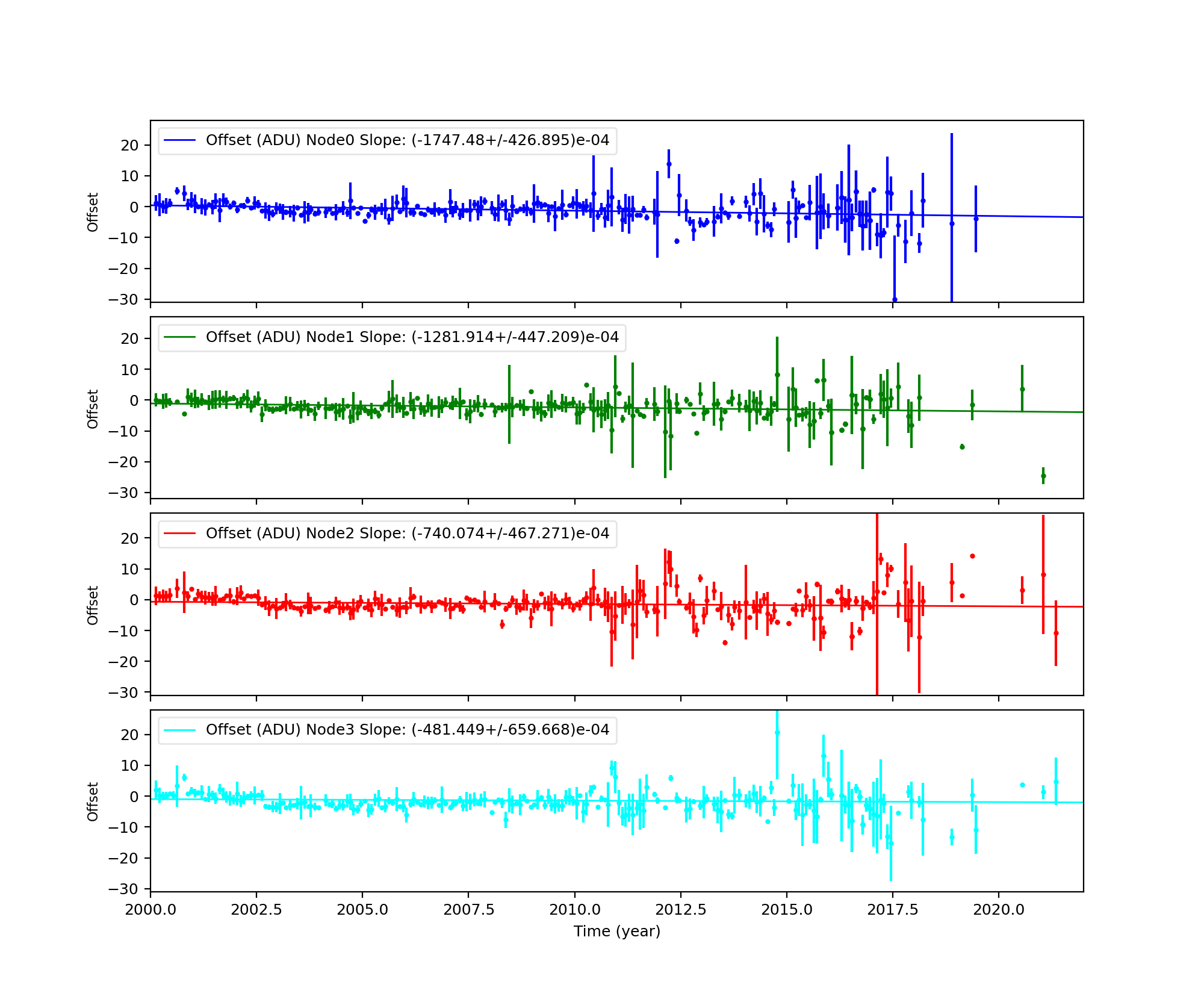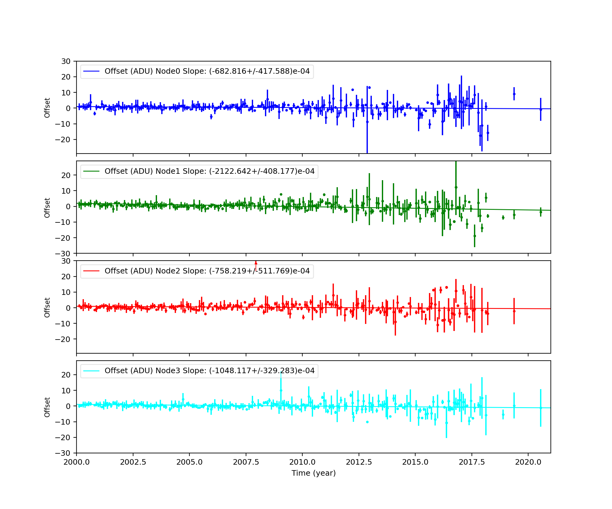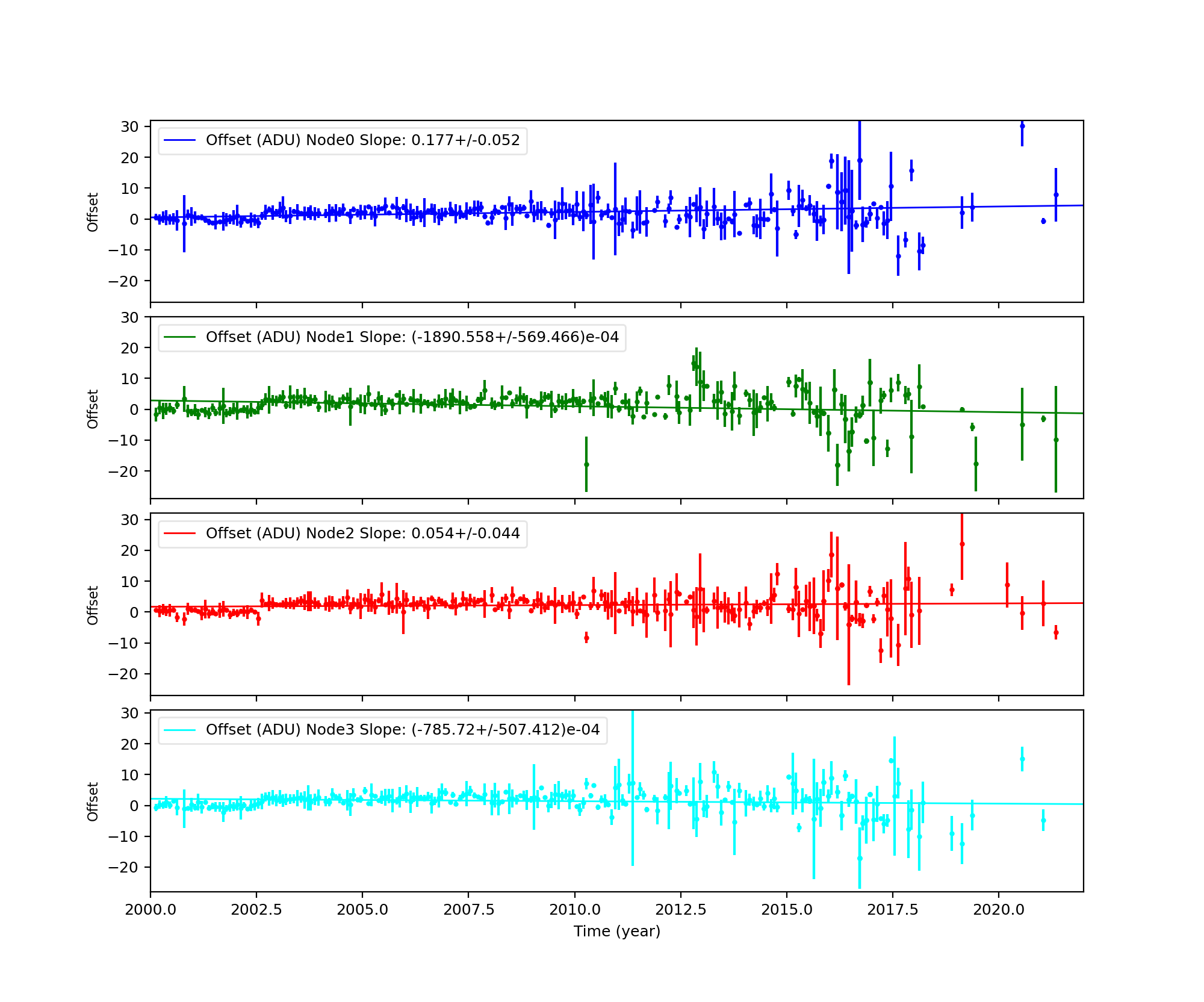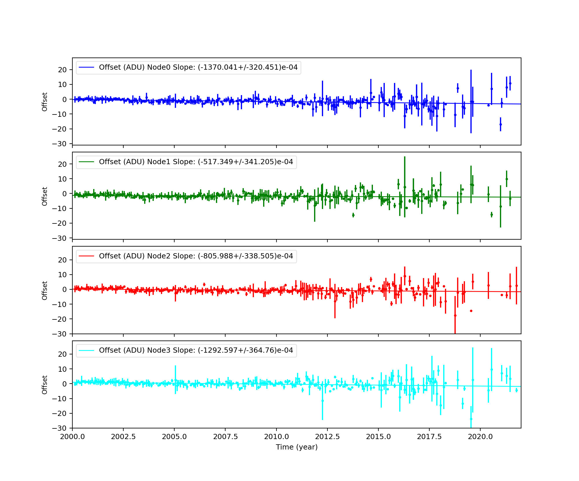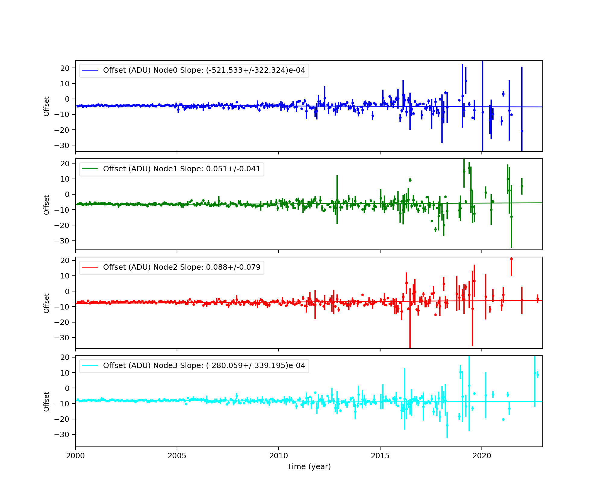 The x axis is in year, and y axis is in ADU/eV for gain plots, and in ADU for offset plots. The slopes are either ADU/eV per year, or ADU per year. Click a plot to enlange it.