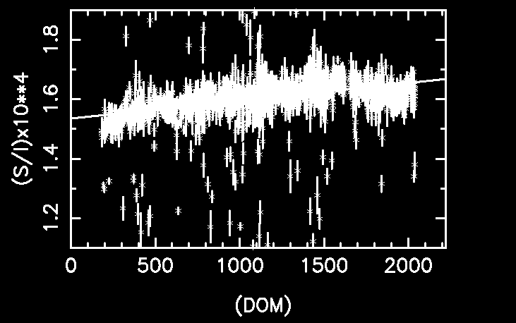 Start Time CTI OBSID End Time Int Time Temperature (S/I)*10**4 sec C -------------------------------------------------------------- ------------------------------- 2004-10-16T15:57:07 1.621+-0.014 60002 2004-10-16T22:07:54 3056 -119.54 2004-10-18T19:22:02 1.594+-0.023 60001 2004-10-19T01:11:27 877 -119.54 2004-10-18T19:22:02 1.611+-0.017 60001 2004-10-19T01:11:27 2043 -119.22 2004-10-18T19:22:02 1.624+-0.020 60001 2004-10-19T01:11:27 1691 -119.38 2004-10-18T19:22:02 1.642+-0.015 60001 2004-10-19T01:11:27 2560 -119.06 2004-10-19T06:53:21 1.617+-0.011 59999 2004-10-19T12:39:26 7669 -119.70 2004-10-21T23:10:52 1.596+-0.027 59995 2004-10-22T05:19:38 949 -119.38 2004-10-21T23:10:52 1.600+-0.012 59995 2004-10-22T05:19:38 3306 -119.70 2004-10-21T23:10:52 1.614+-0.012 59995 2004-10-22T05:19:38 3954 -119.54 2004-10-24T03:47:48 1.566+-0.019 59994 2004-10-24T07:34:28 1986 -119.70 2004-10-24T03:47:48 1.645+-0.012 59994 2004-10-24T07:34:28 5660 -119.54 2004-10-24T13:43:16 1.626+-0.009 59992 2004-10-24T20:17:41 8259 -119.70 2004-10-26T17:44:44 1.599+-0.009 59991 2004-10-26T23:35:23 7785 -119.70 2004-10-27T05:14:39 1.609+-0.009 59989 2004-10-27T11:19:03 8257 -119.70 2004-10-29T10:45:10 1.623+-0.010 59987 2004-10-29T15:02:26 7769 -119.70 -------------------------------