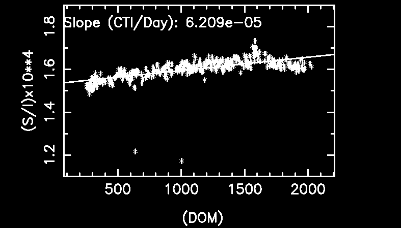 Since we are correcting the data to CTIs observed at the focal plane temperature -119.7 C, we first estimate how CTI evolves with time using CTIs at -119.7 C and the integration time longer than 7,000 sec.