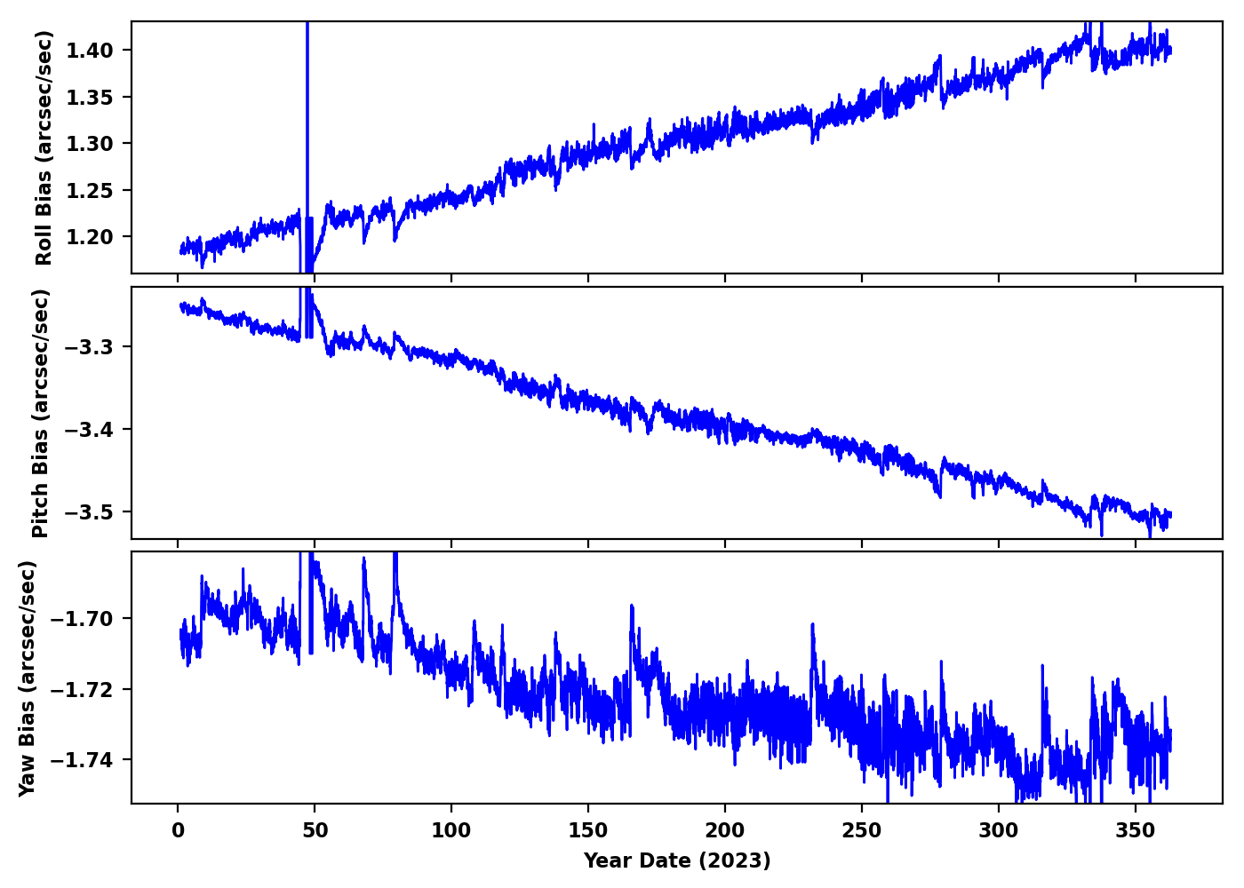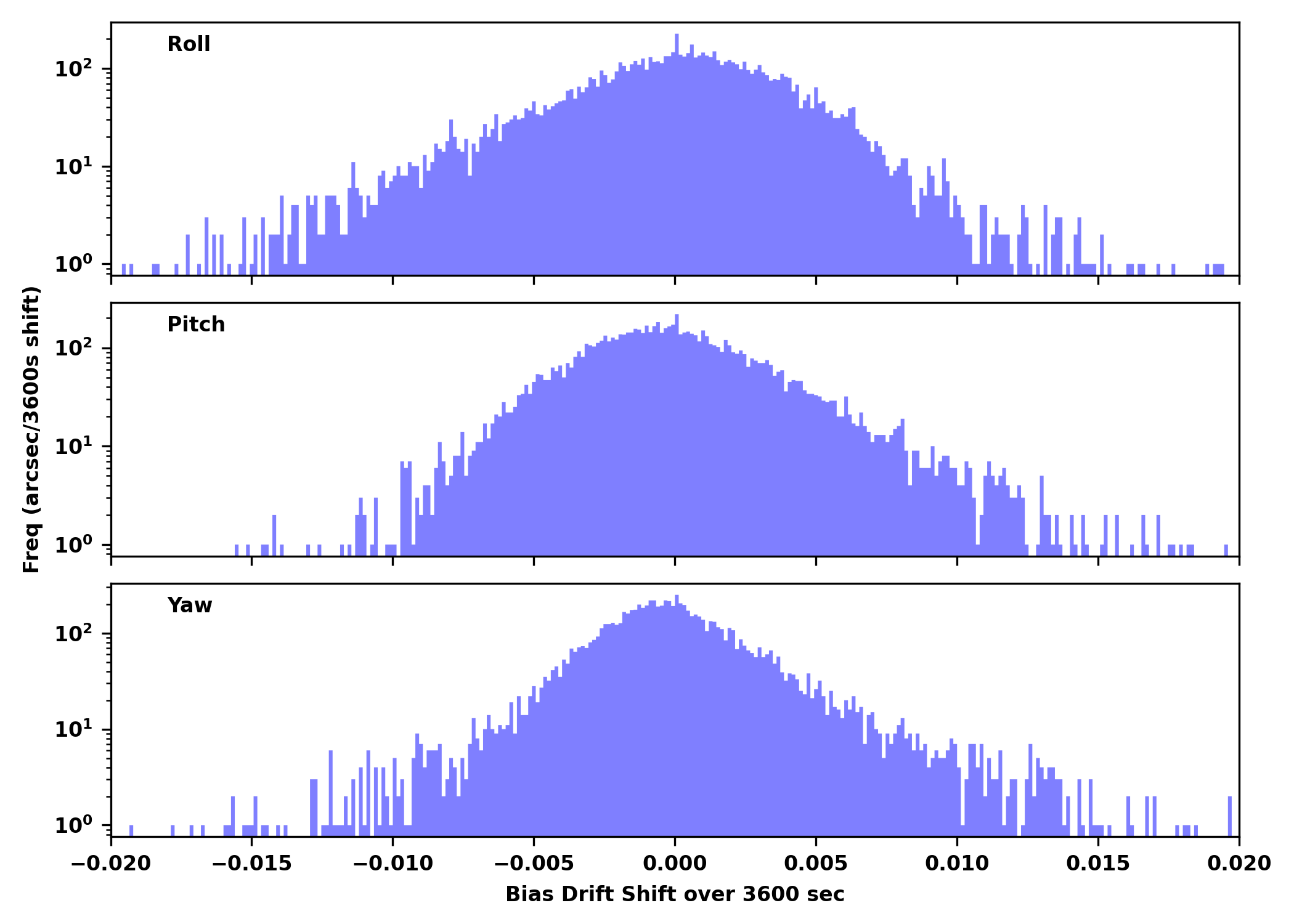 The left plots below are time trends of IRU gyro biases. The first panel shows the roll bias, the second panel shows the pitch bias, and the bottom panel shows the yaw bias. Each data point is an average value over one hour. The unit is arcsec /sec.
