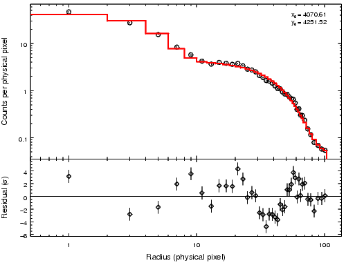 ![[Print media version: Two plots, vertically aligned. The top plot, which covers about two thirds of the height, shows a radial profile of the surface brightness, along with a model fit. The bottom plot shows the residuals (in units of "sigma").]](imgs/sur_bri.png)